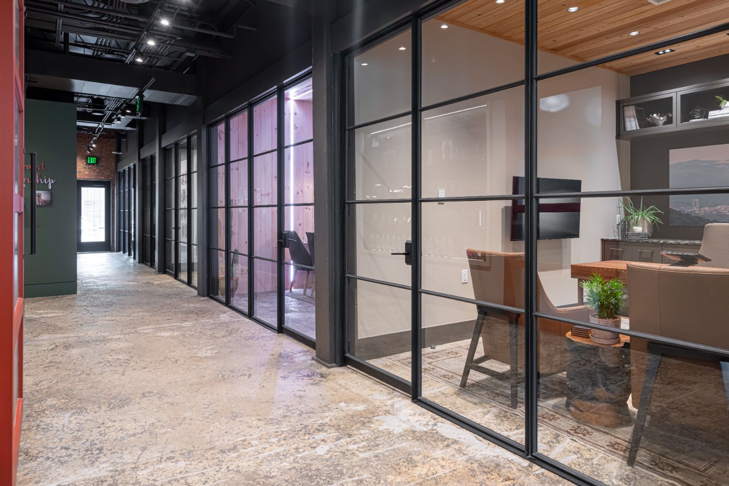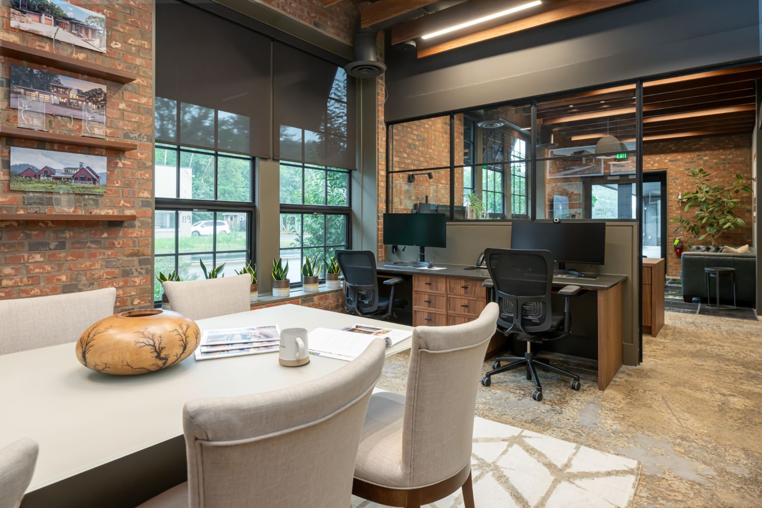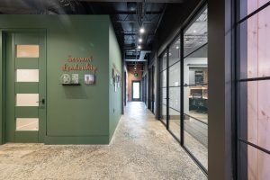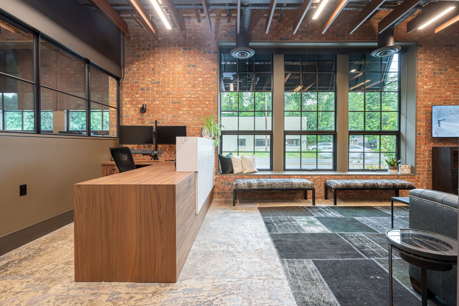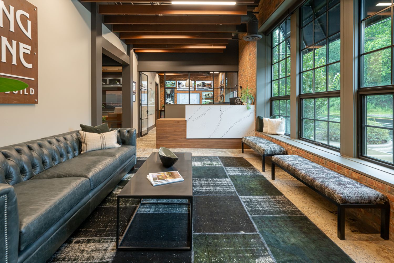 Welcome to our renovation project for our office in Asheville, NC. The building, formerly a factory with adjacent train tracks running parallel to Sweeten Creek, underwent thoughtful transformation. Our goal was to preserve the character of the original structure, and we achieved this by sanding the concrete floors to showcase their unique texture and covering brick walls in select areas.