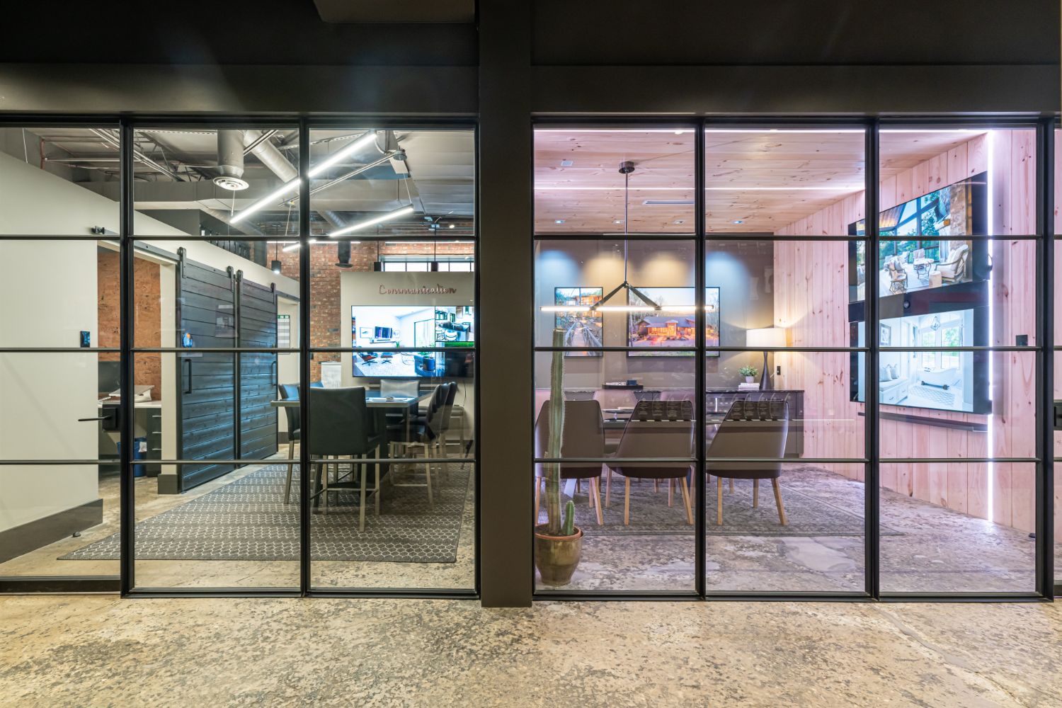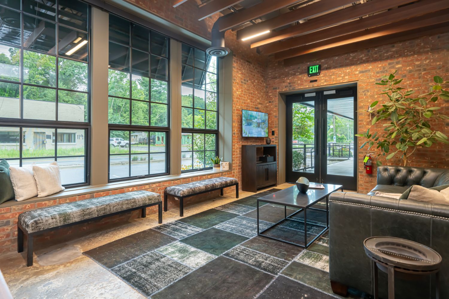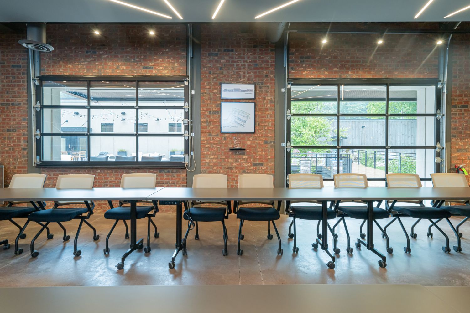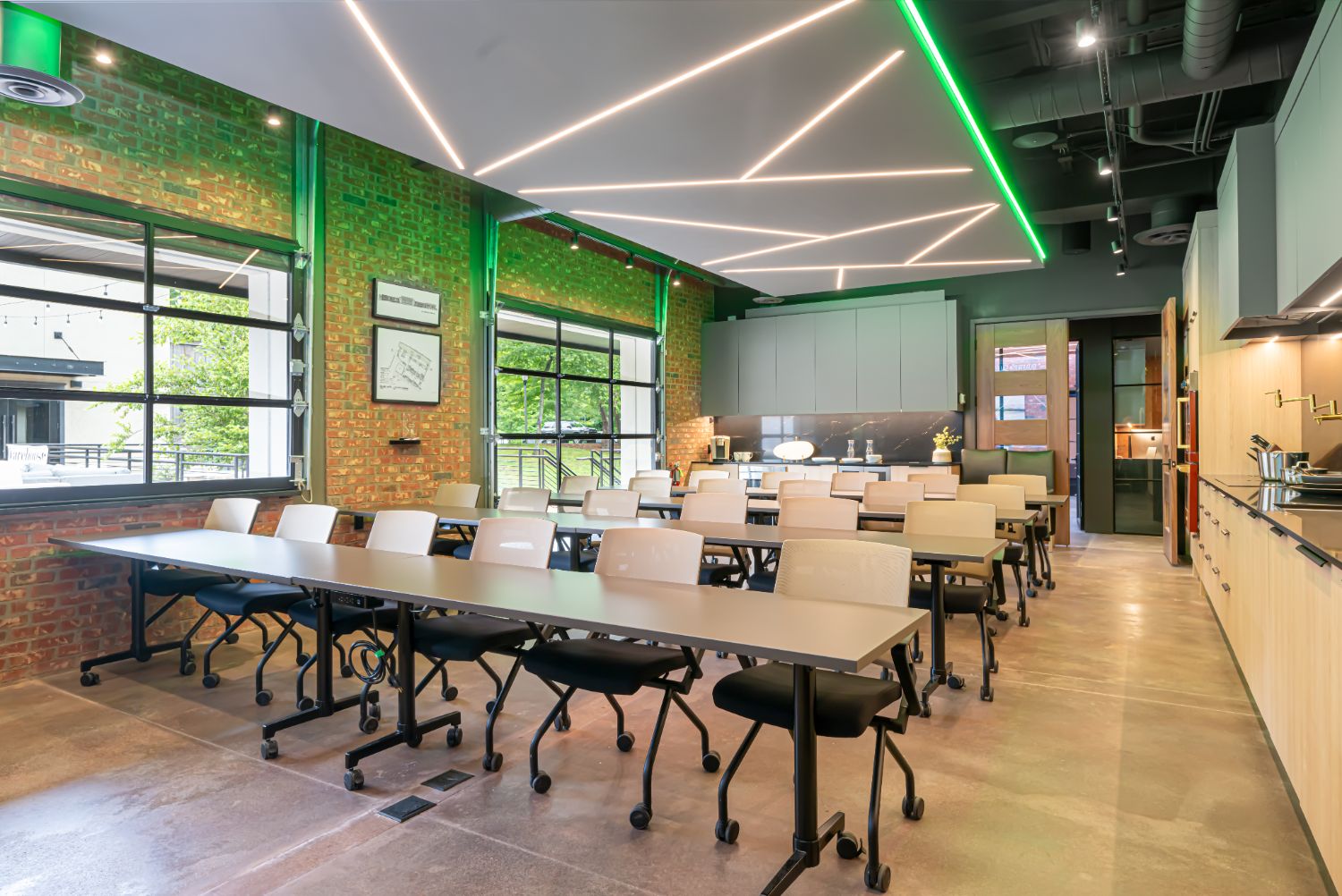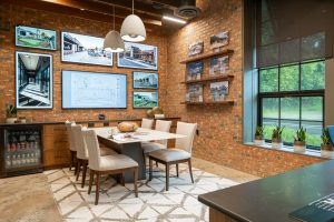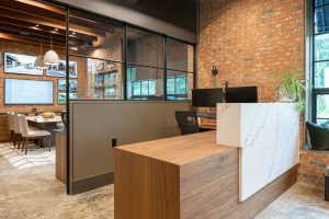 Welcome to our renovation project for our office in Asheville, NC. The building, formerly a factory with adjacent train tracks running parallel to Sweeten Creek, underwent thoughtful transformation. Our goal was to preserve the character of the original structure, and we achieved this by sanding the concrete floors to showcase their unique texture and covering brick walls in select areas.