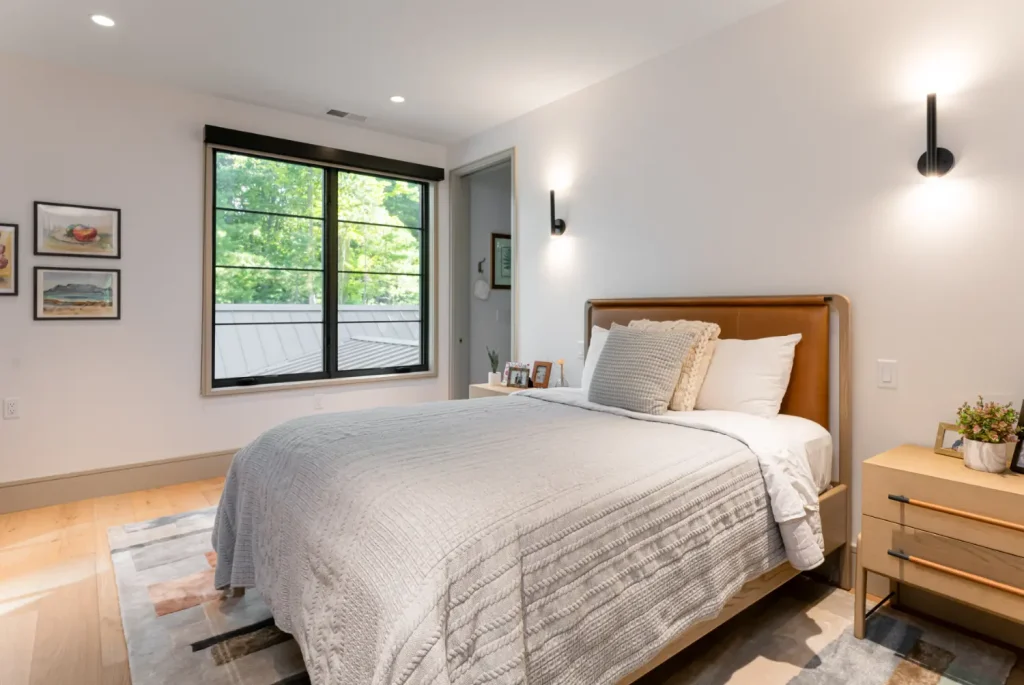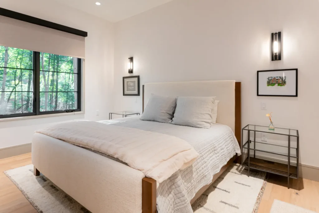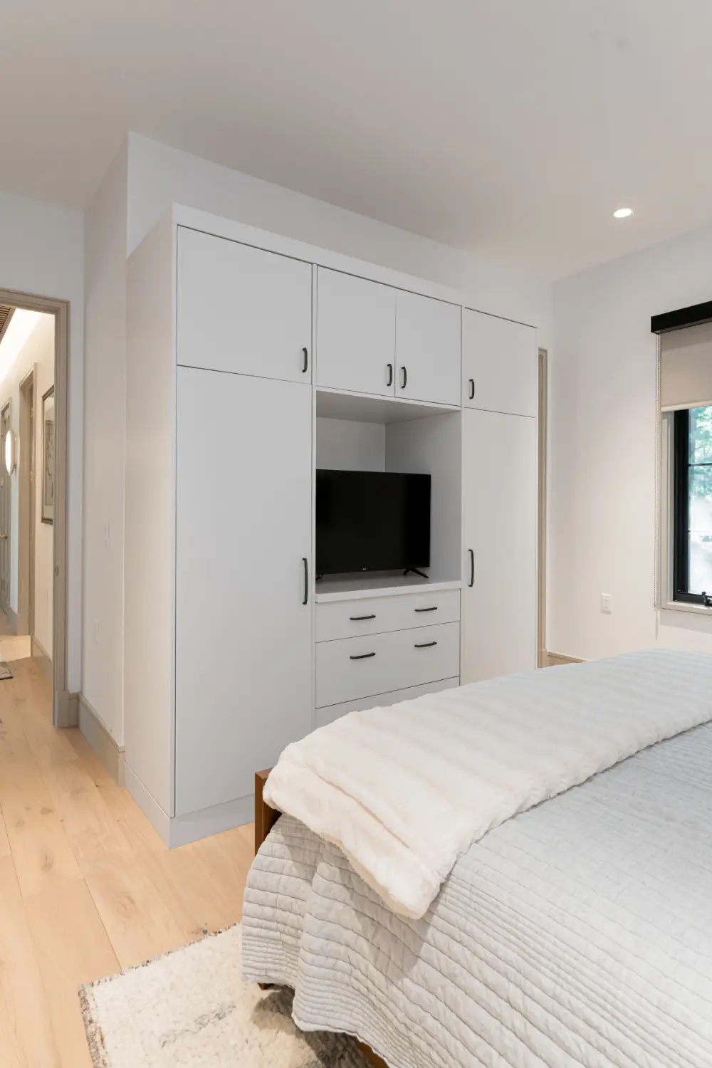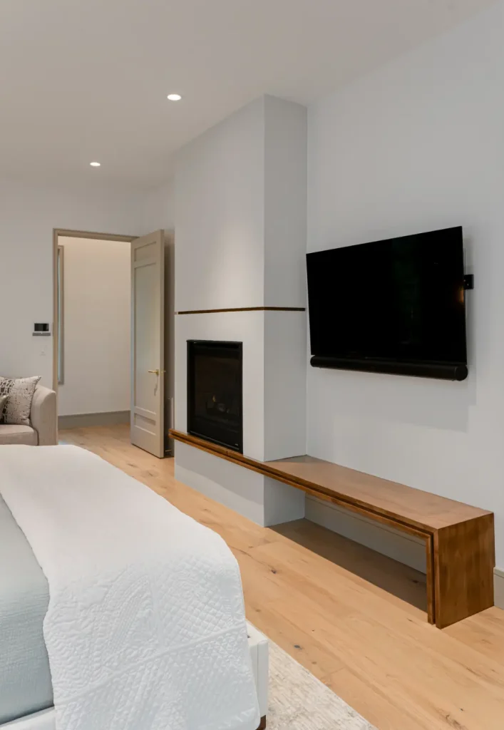 The master bedroom stands out with a captivating mix of stucco and wood detailing. This thoughtful combination adds depth and texture, making it a perfect place to unwind after a long day.