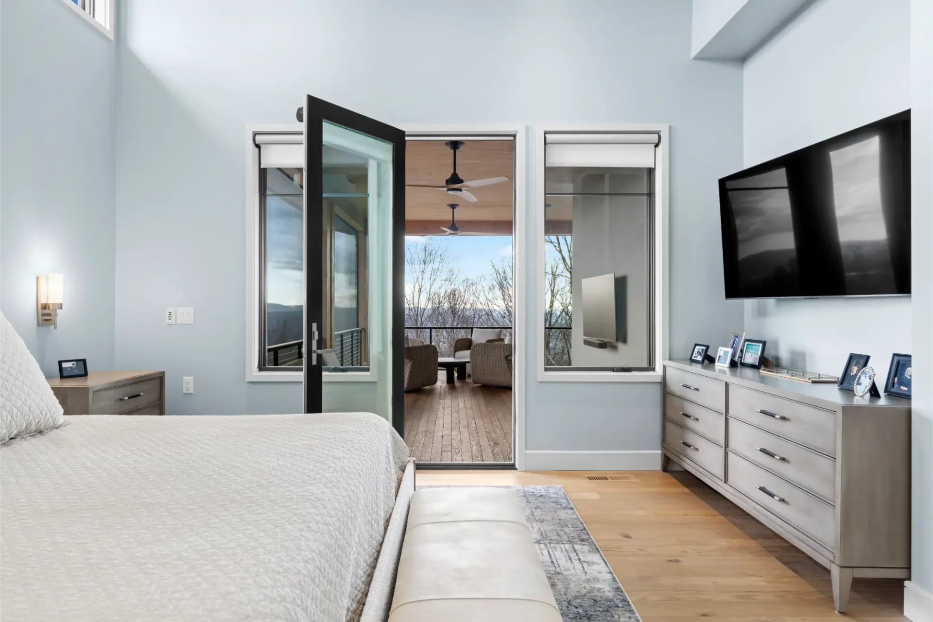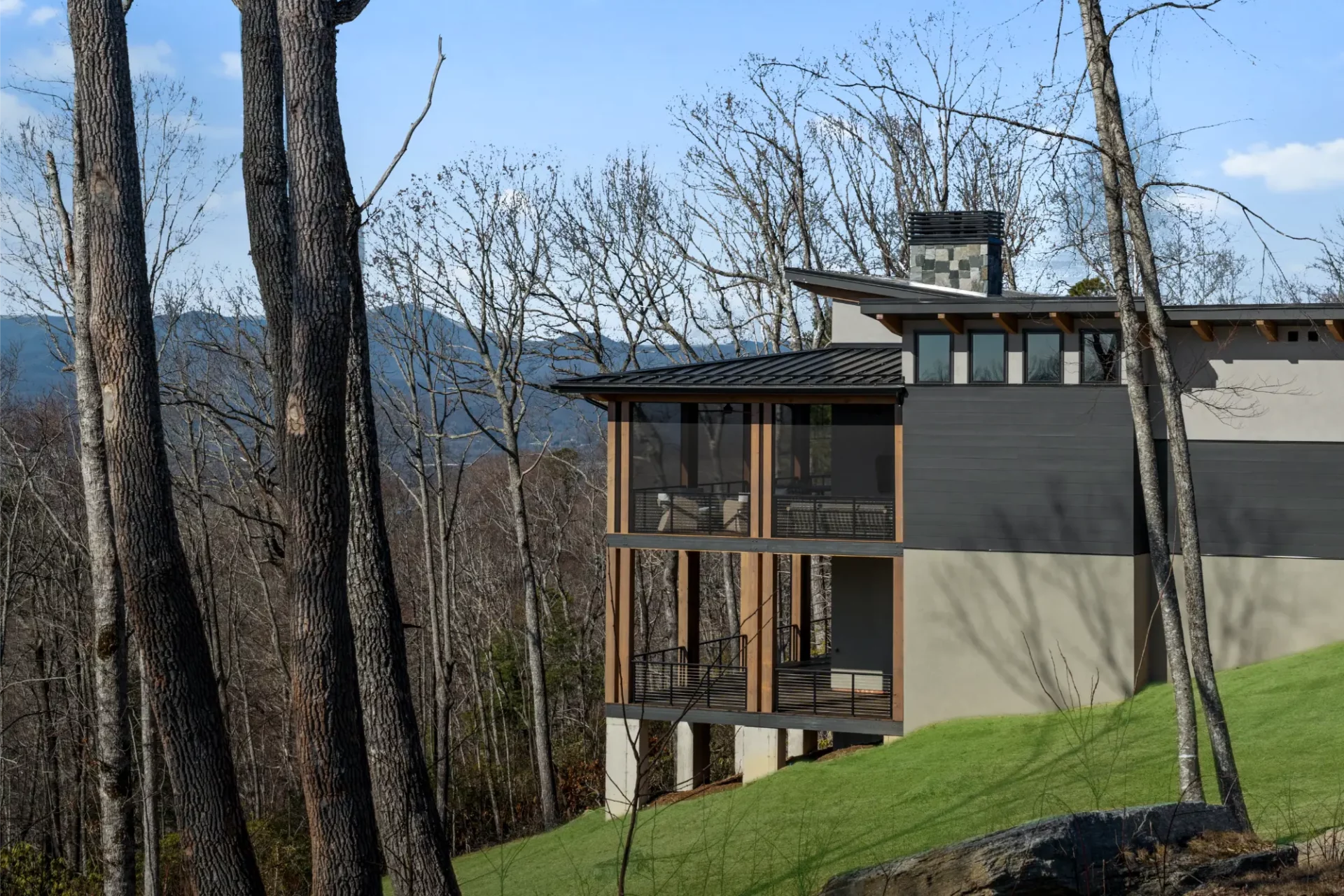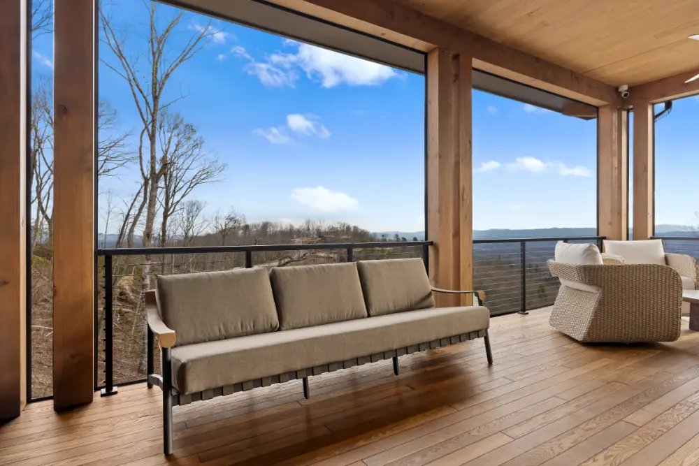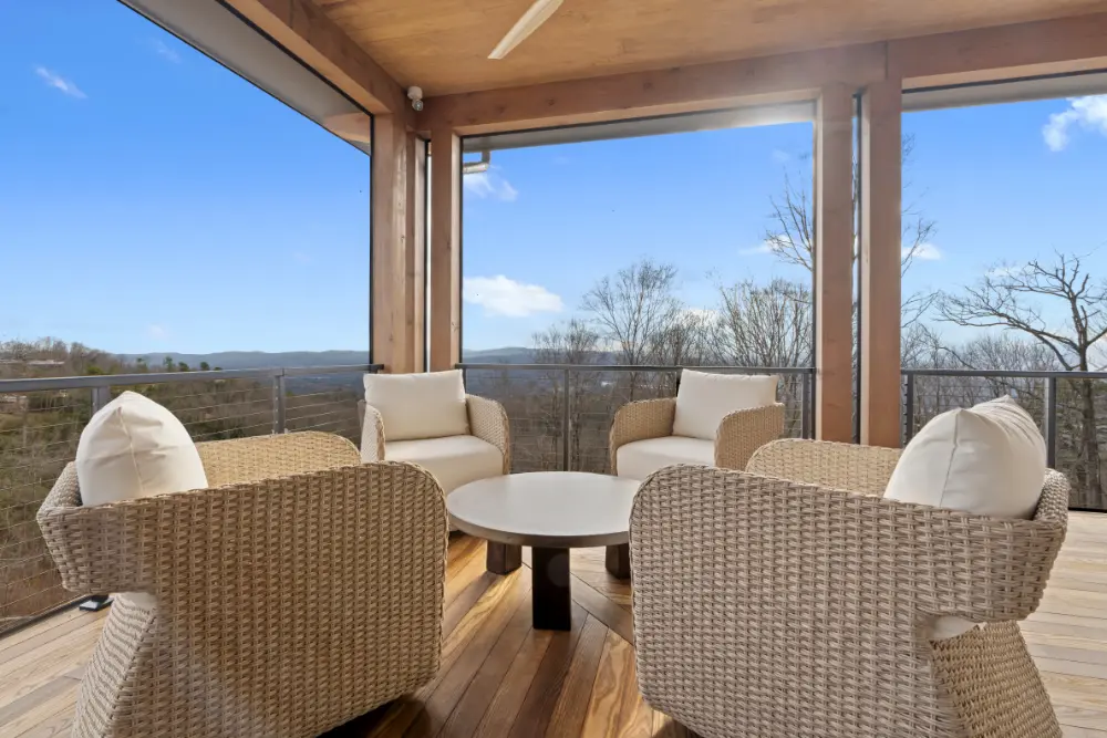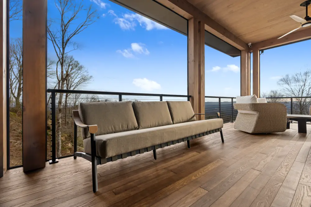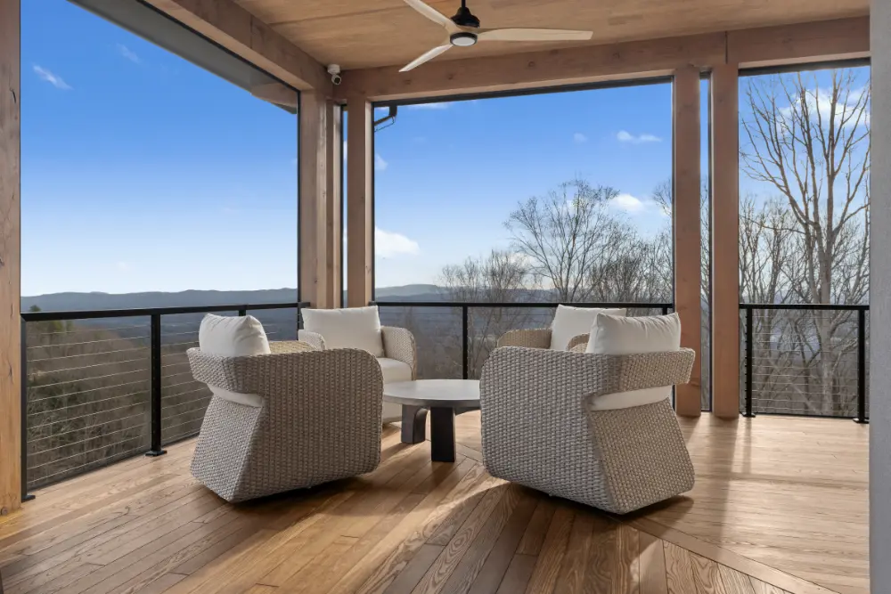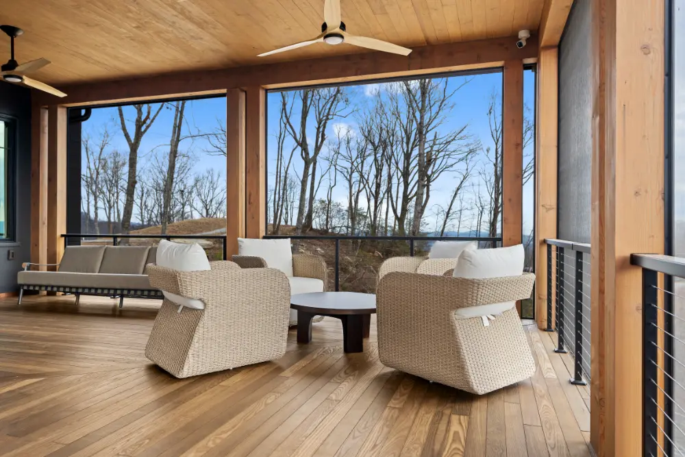 To fully embrace the beautiful surrounding landscape, the home features floor-to-ceiling sliding doors that open to screened sitting porches on each floor. This design seamlessly blends biophilic principles with abundant natural light, creating a serene living experience that integrates the home with its natural environment.