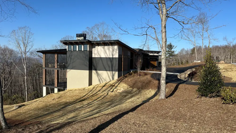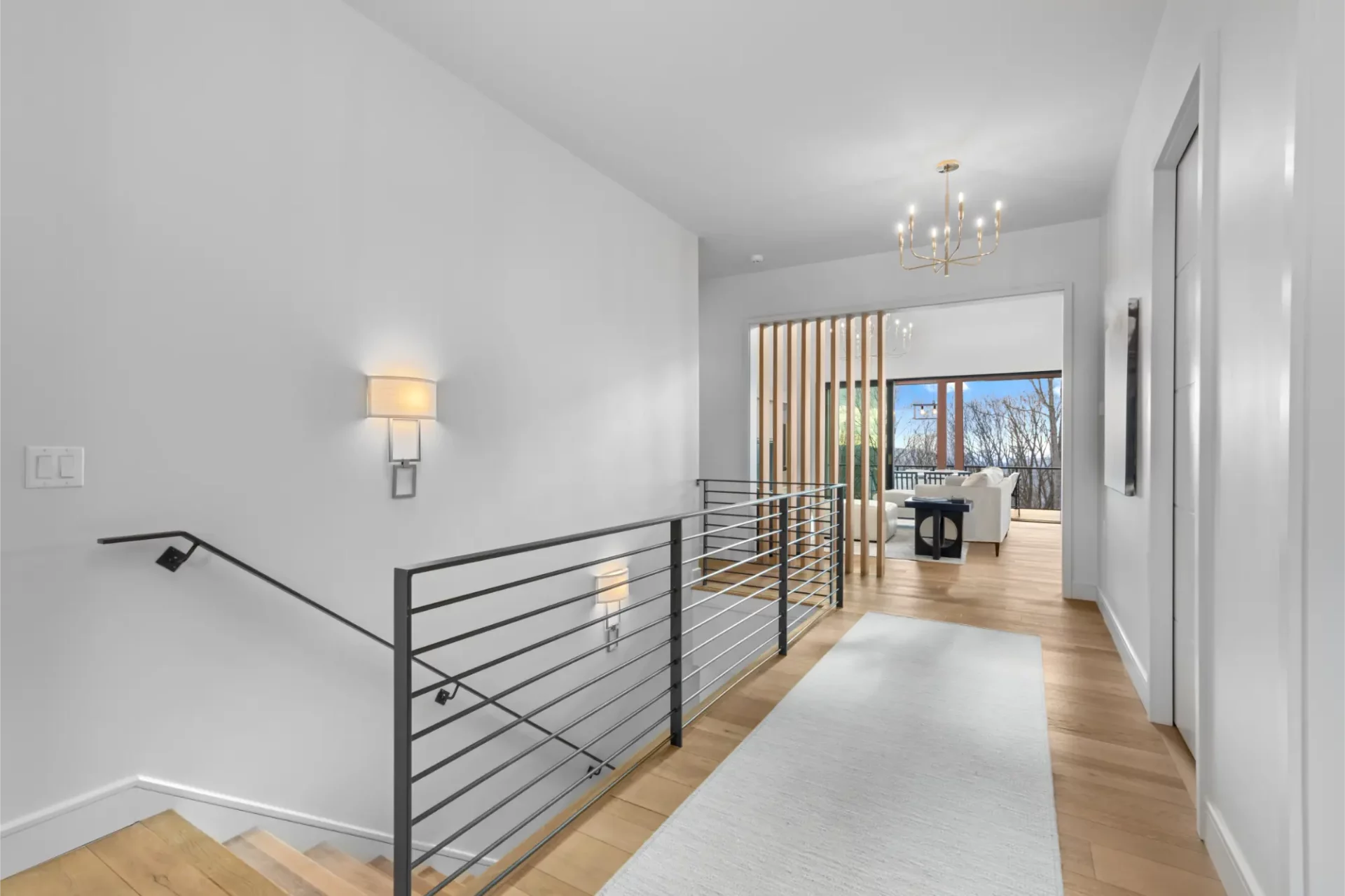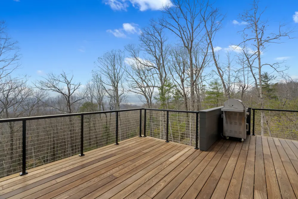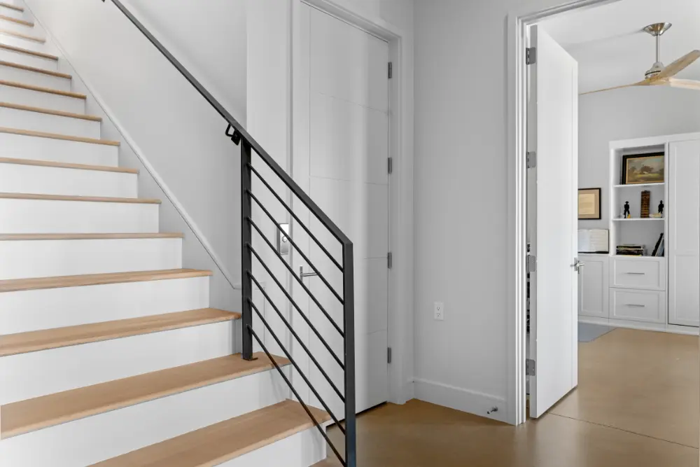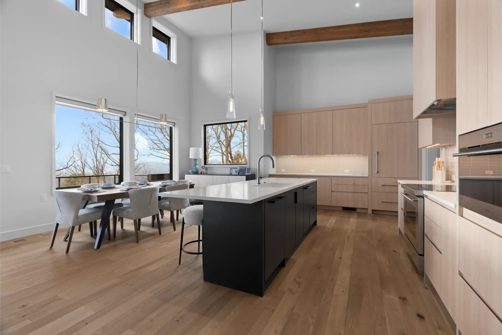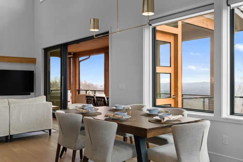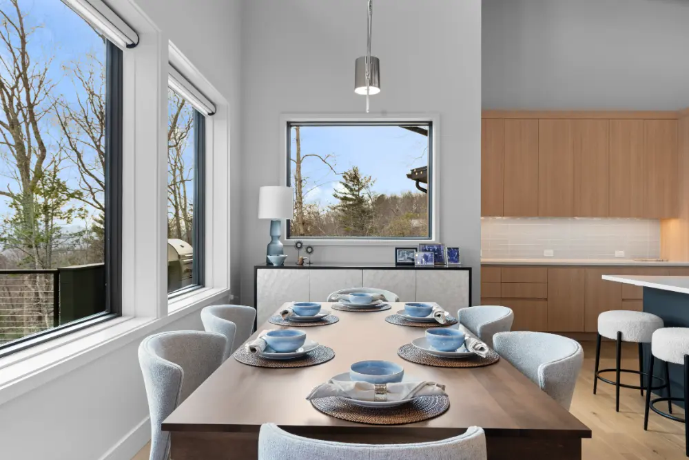To fully embrace the beautiful surrounding landscape, the home features floor-to-ceiling sliding doors that open to screened sitting porches on each floor. This design seamlessly blends biophilic principles with abundant natural light, creating a serene living experience that integrates the home with its natural environment.