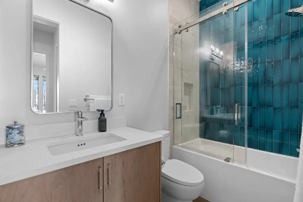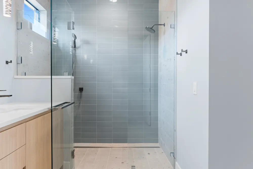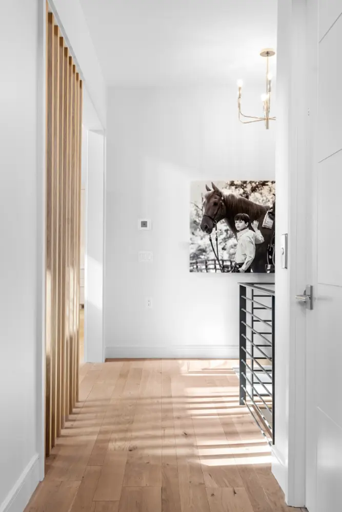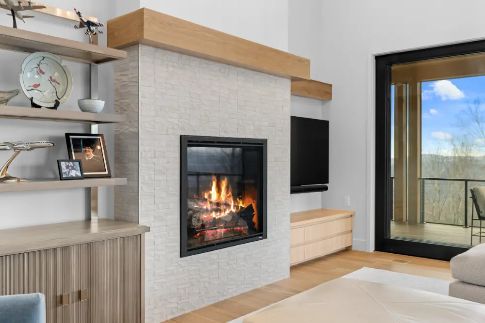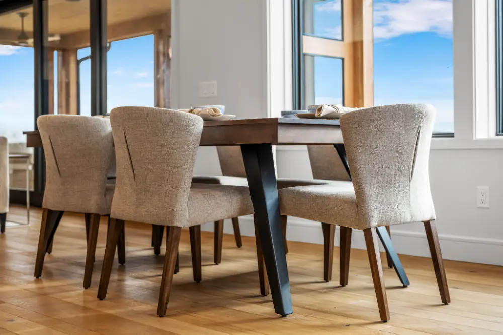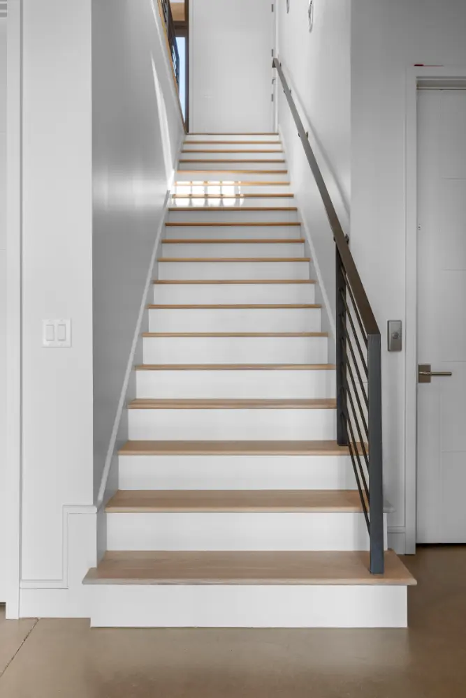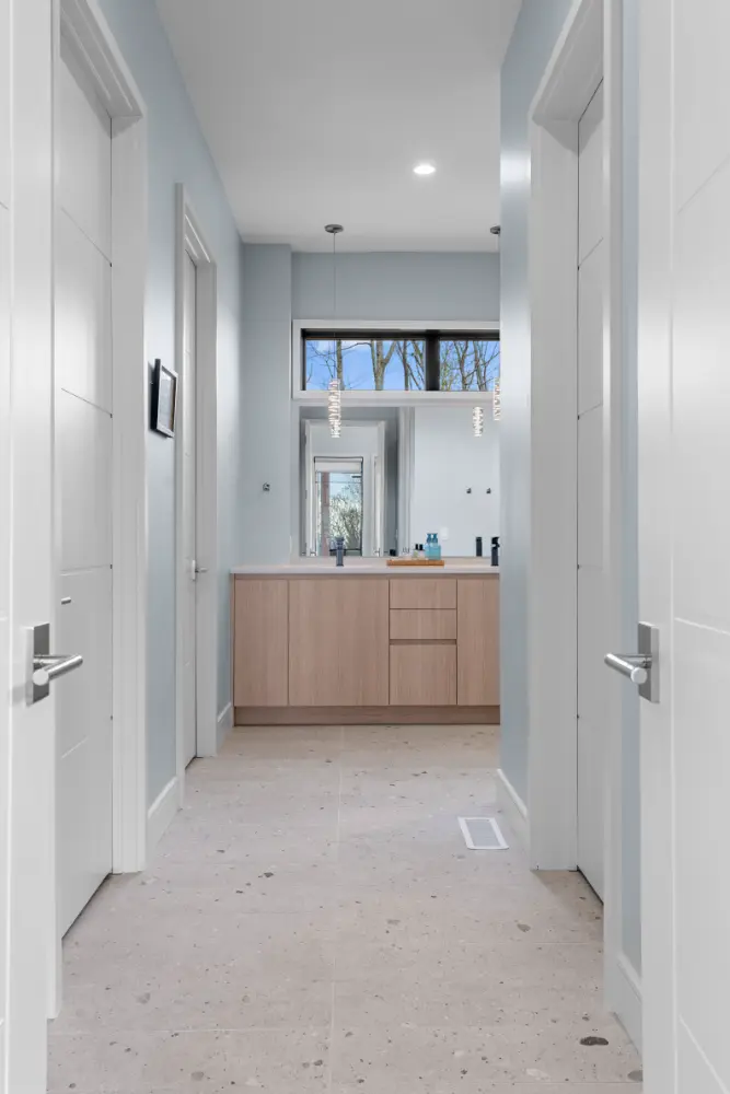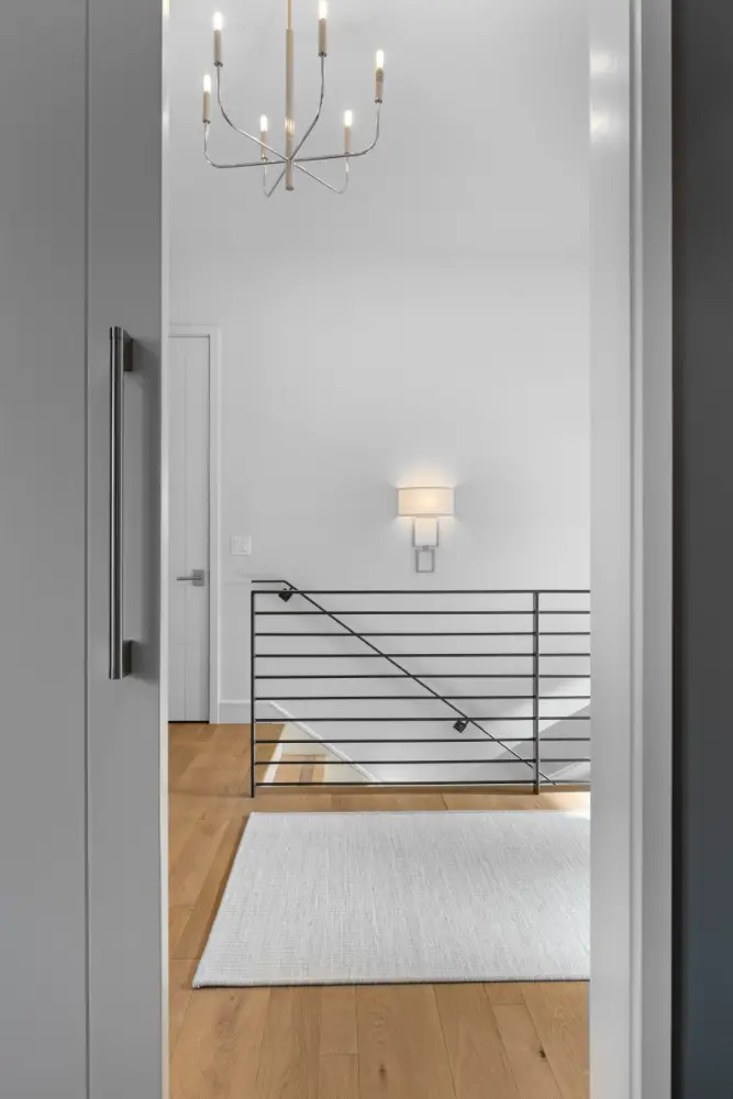 To fully embrace the beautiful surrounding landscape, the home features floor-to-ceiling sliding doors that open to screened sitting porches on each floor. This design seamlessly blends biophilic principles with abundant natural light, creating a serene living experience that integrates the home with its natural environment.