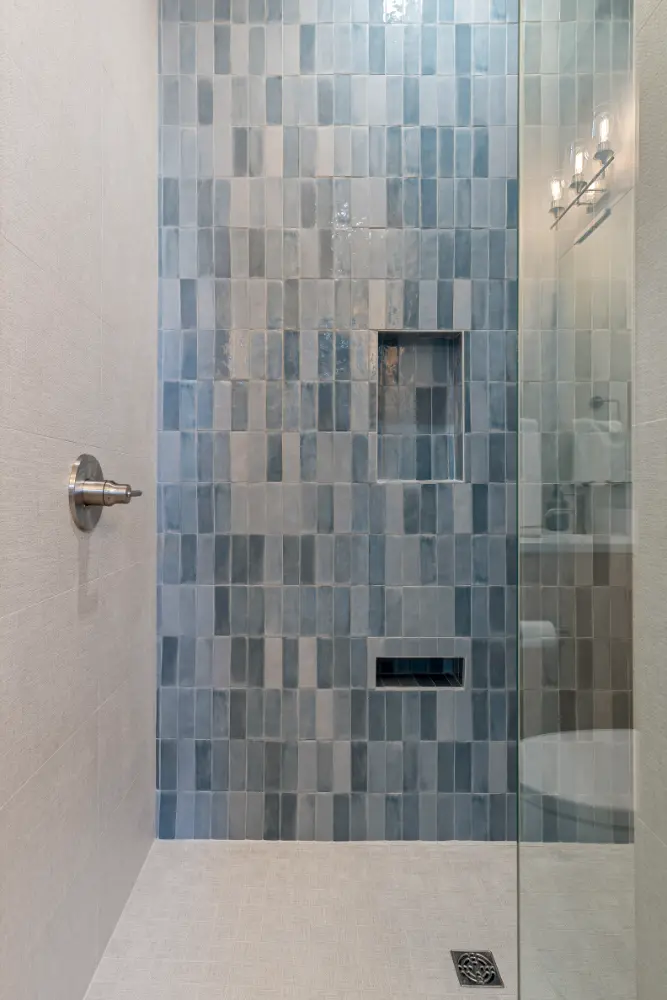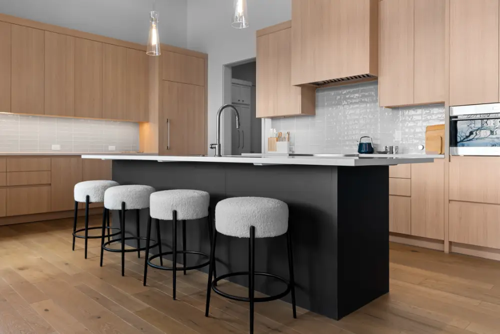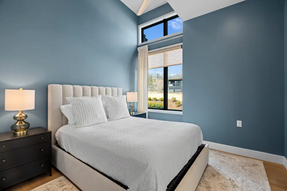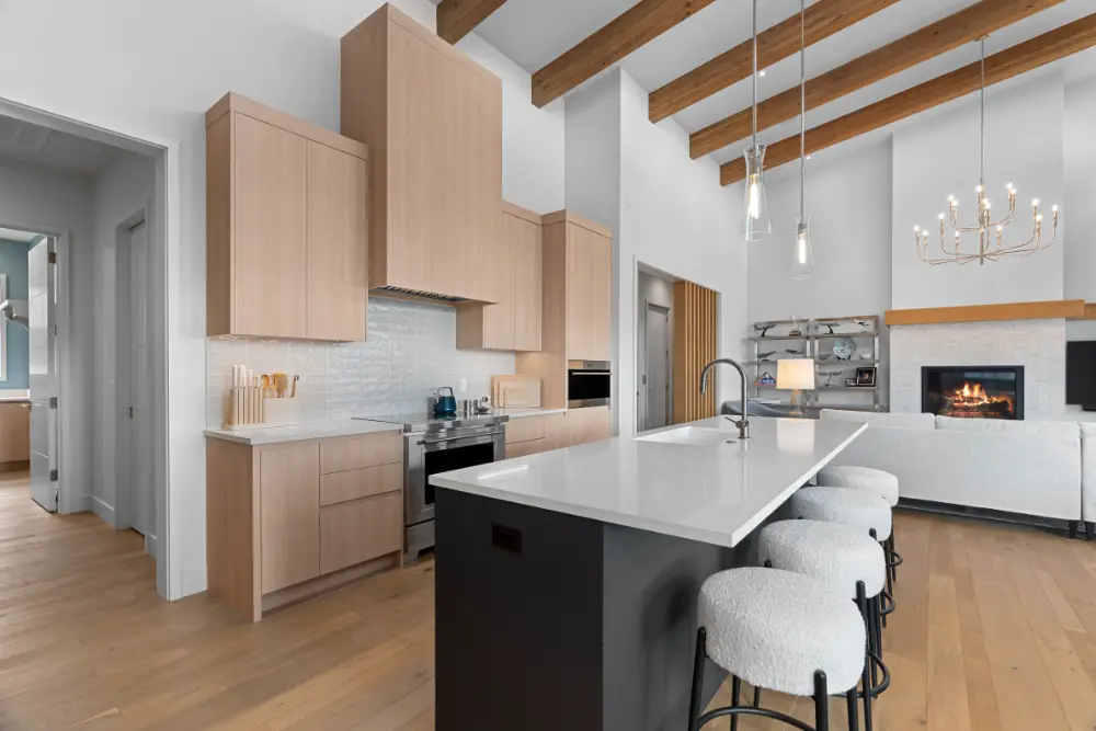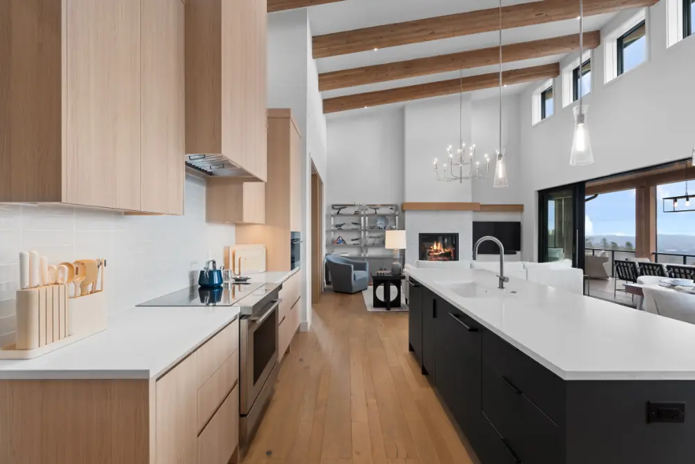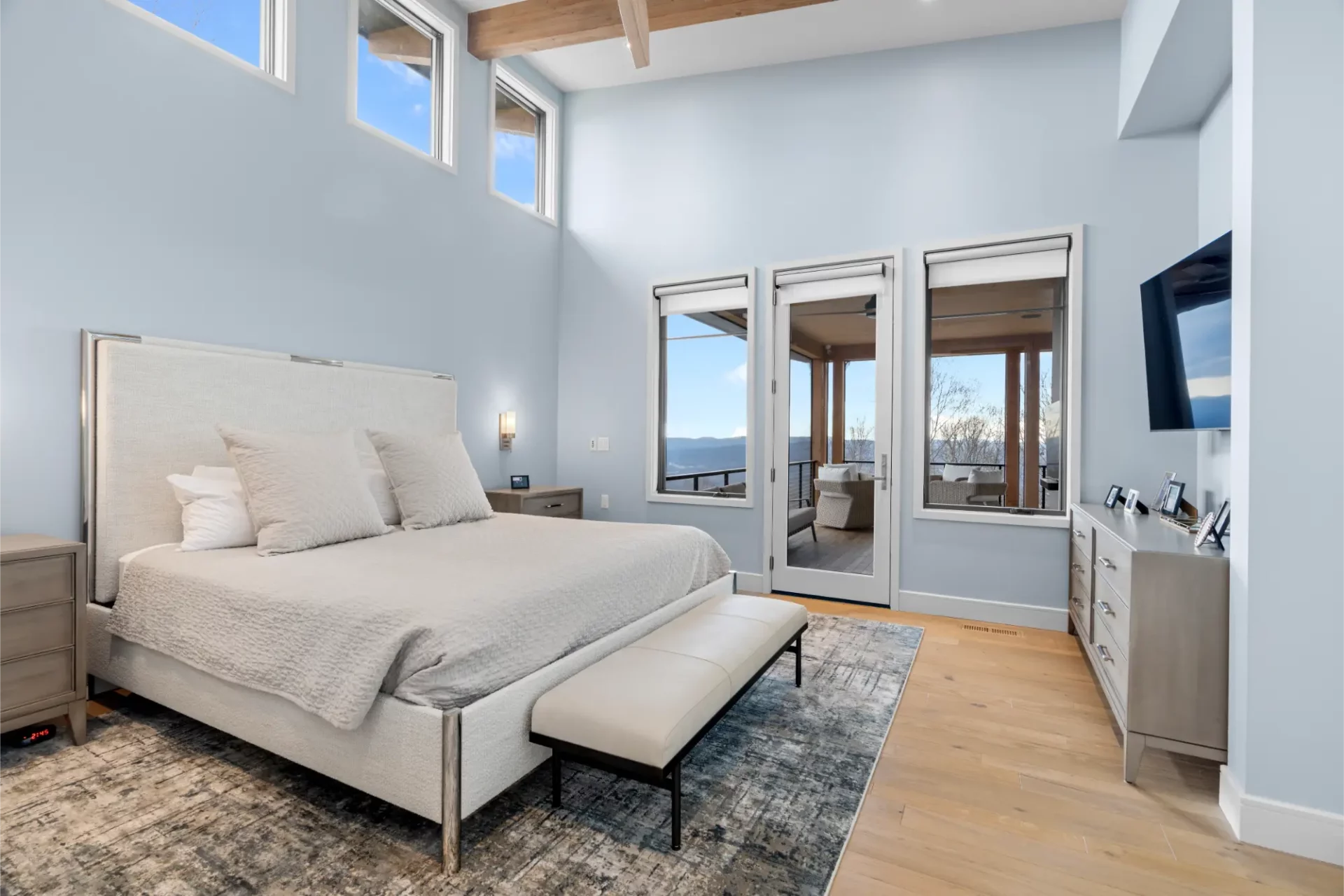 The home’s interior design embodies a soft, light, and modern aesthetic. Rich tones of blue, the touch of lush stones, and the warmth of wooden beams come together in a study of luminous minimalism. This refined palette and material palette create a calming, elevated atmosphere that complements the home’s spectacular mountain views.