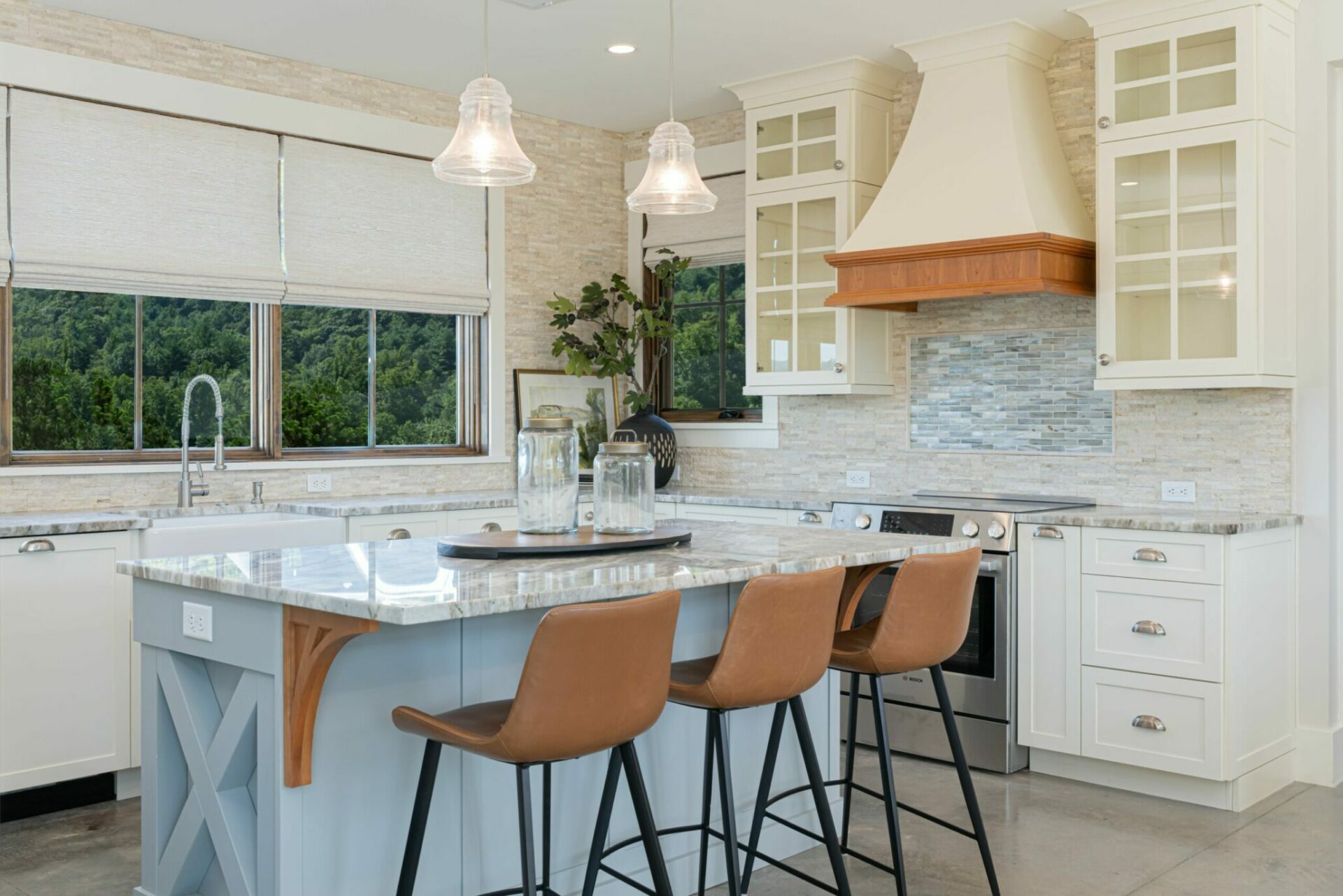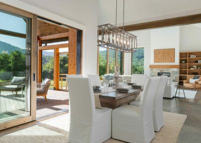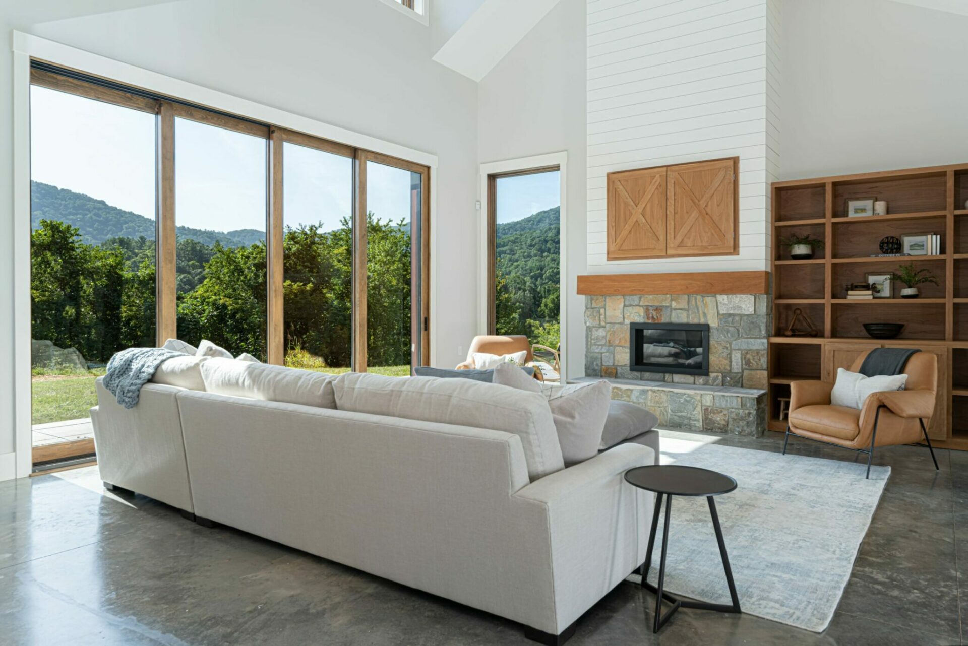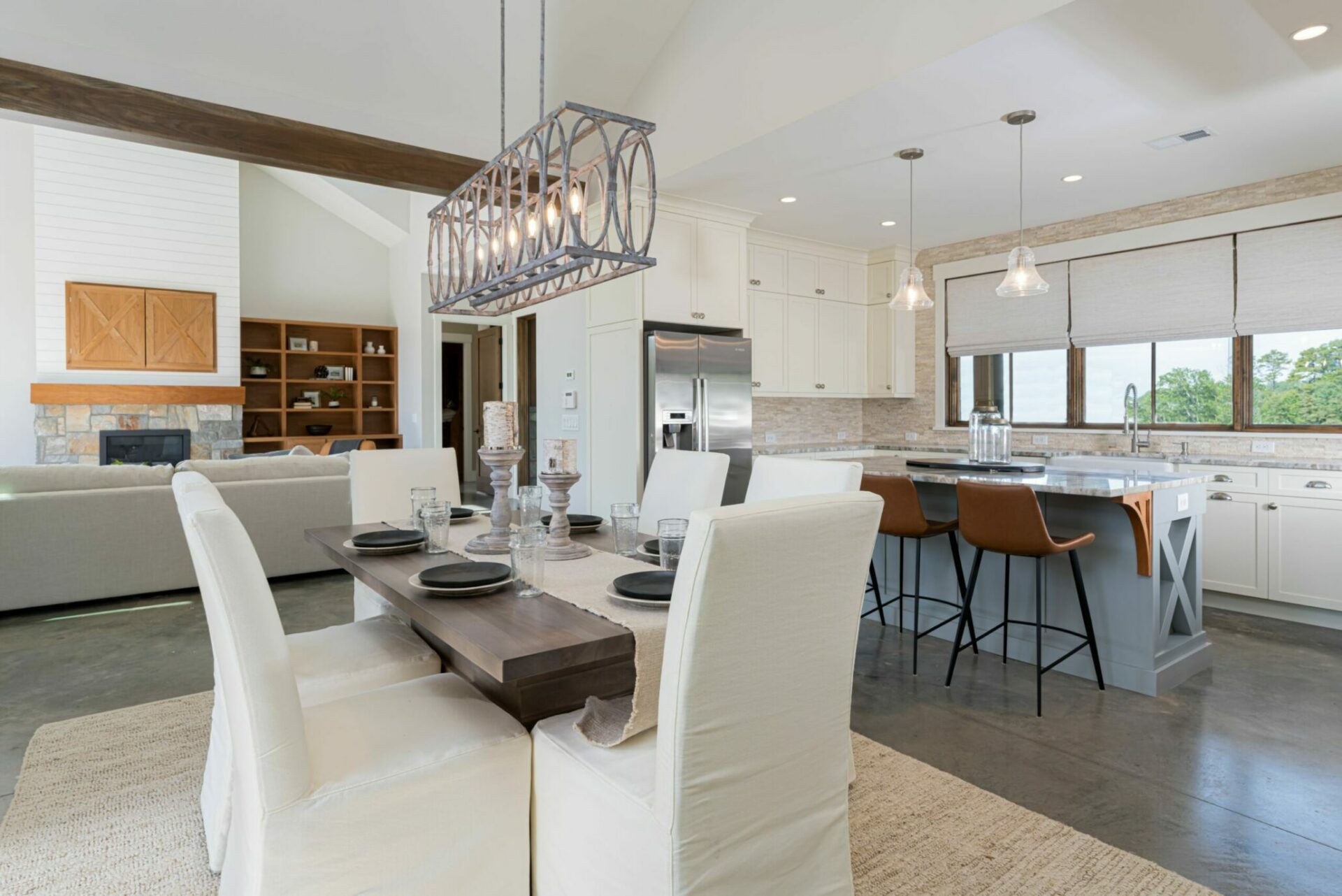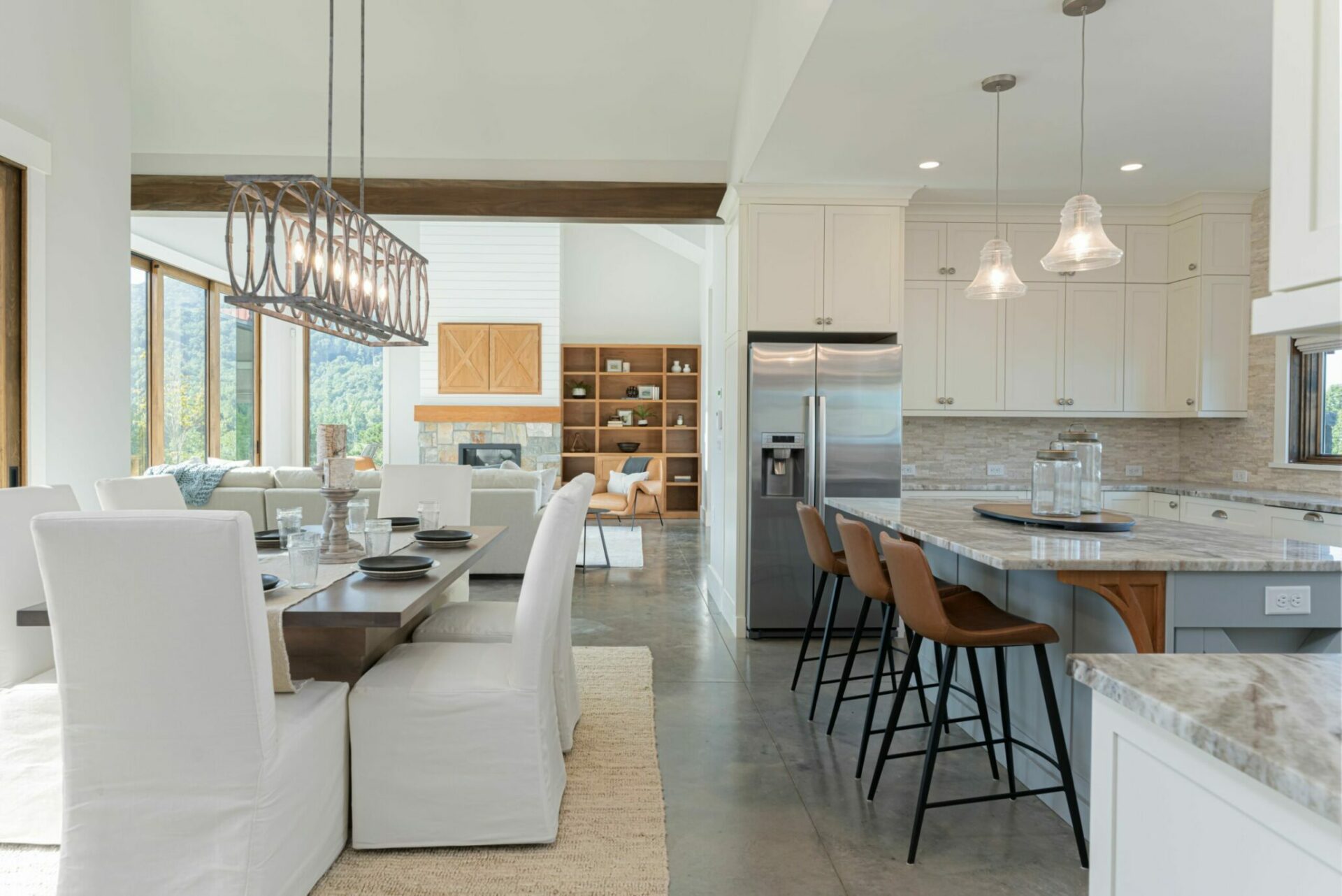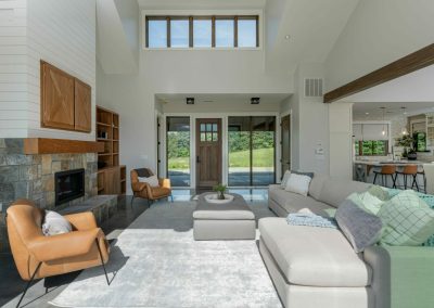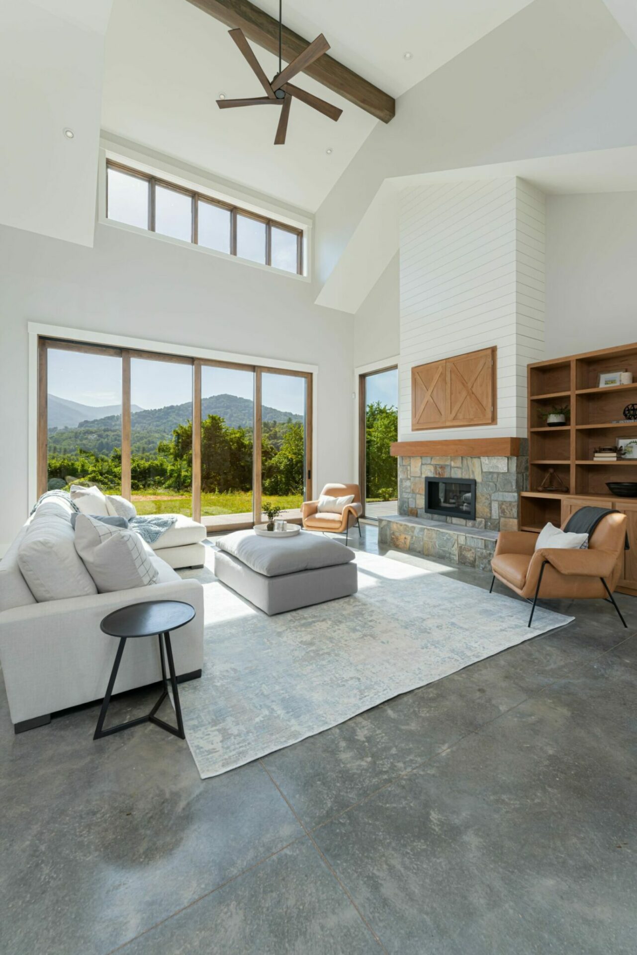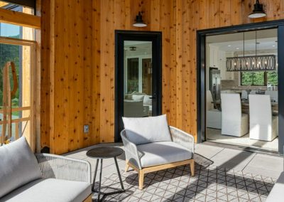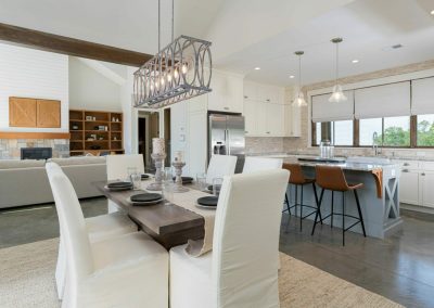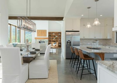 For style and aesthetics, our clients wanted a modern farmhouse style incorporated throughout their home. Exposed beams and concrete floors contributed to the rustic farmhouse feel, whereas the stylish furnishings, built-ins, and accessories highlight the modern aspect of this home. We included large sliding glass doors to create an extension of the home, while bringing the outdoors inside. Neutrals and rich honey-colored tones can be found throughout the home, allowing the interior to accentuate the exterior views. The kitchen includes textured tile from countertop to ceiling, and there is layered lighting included in the kitchen as well as throughout the home.