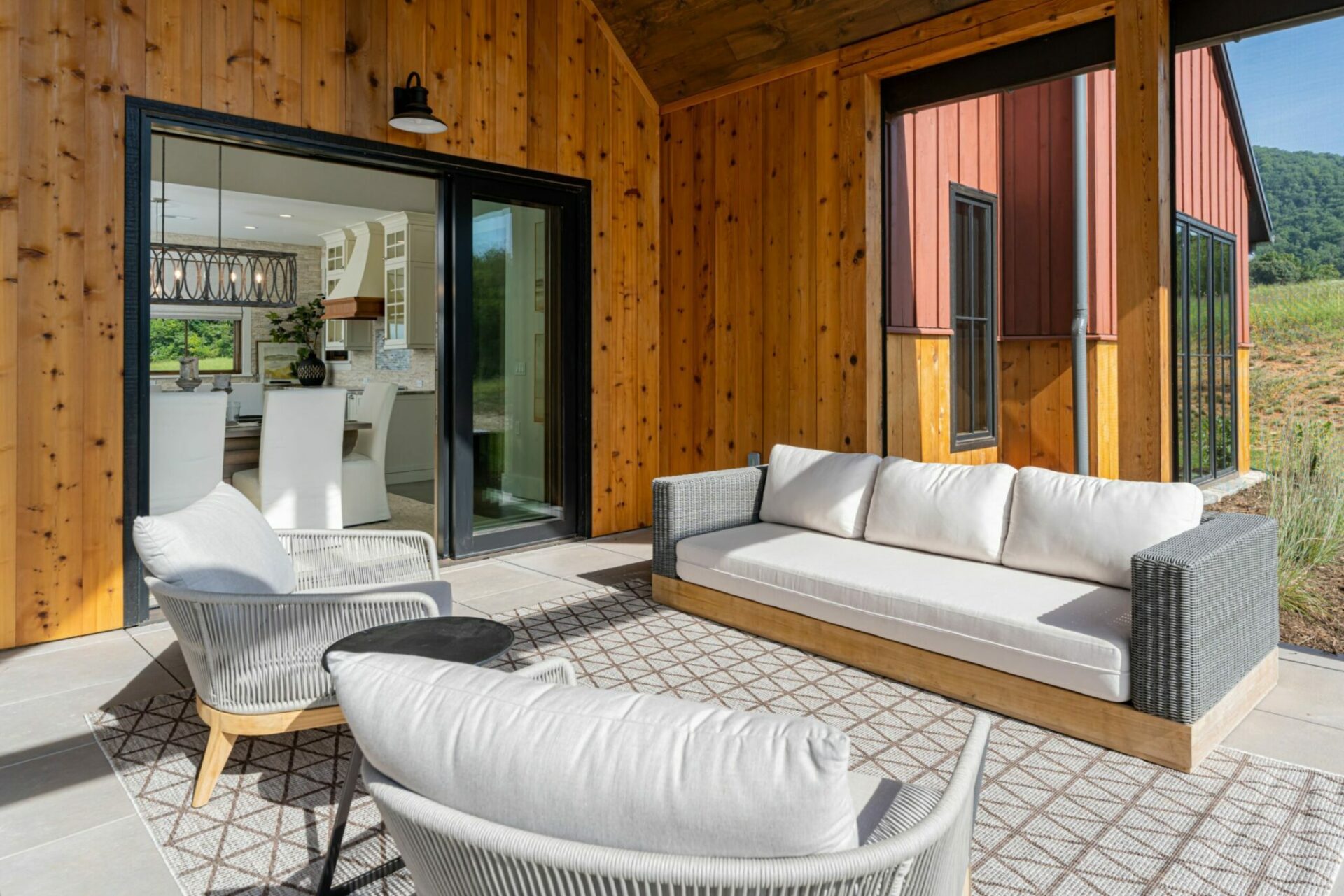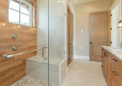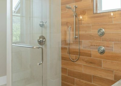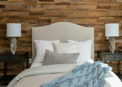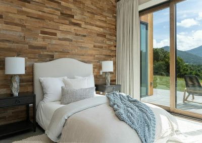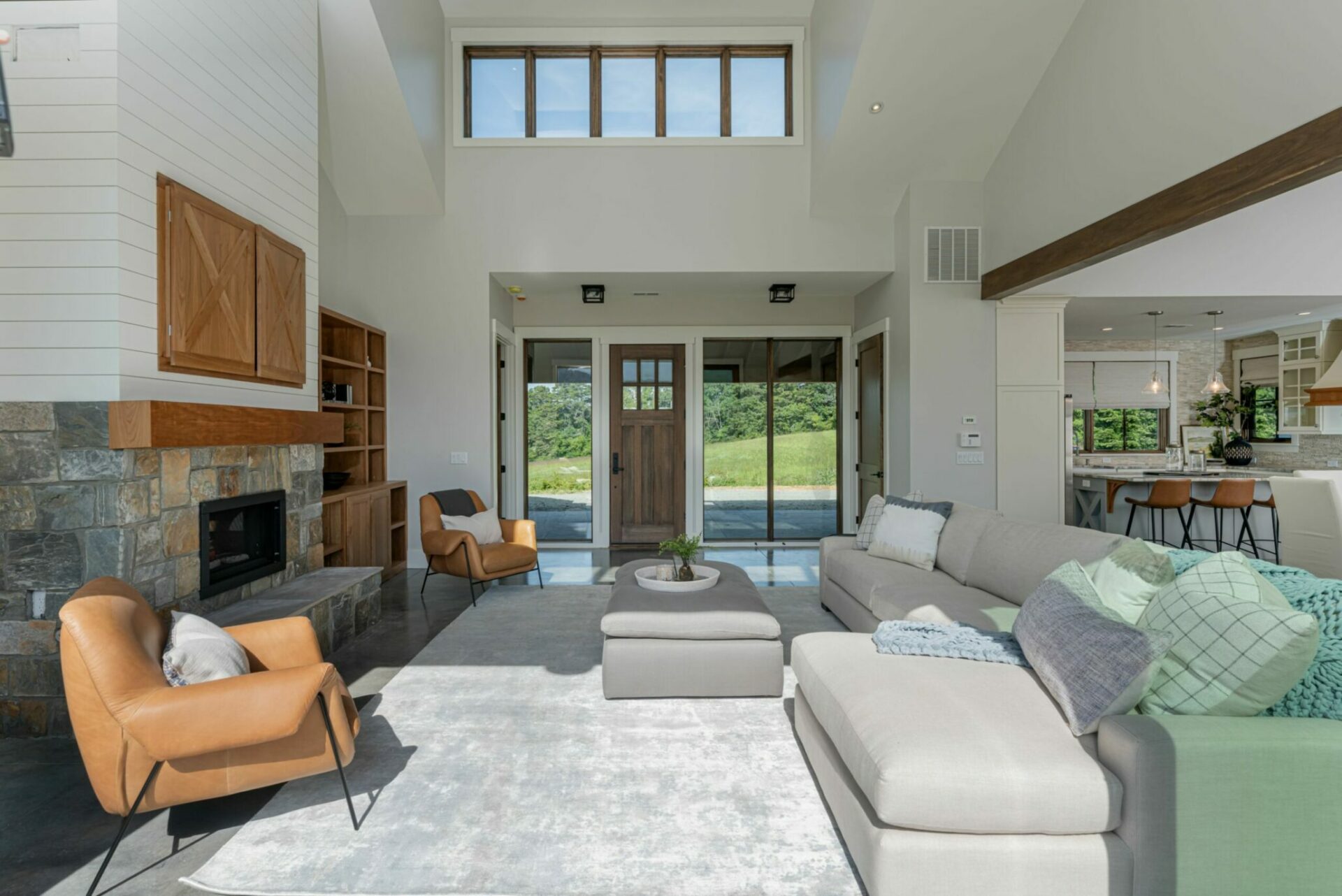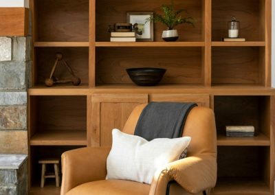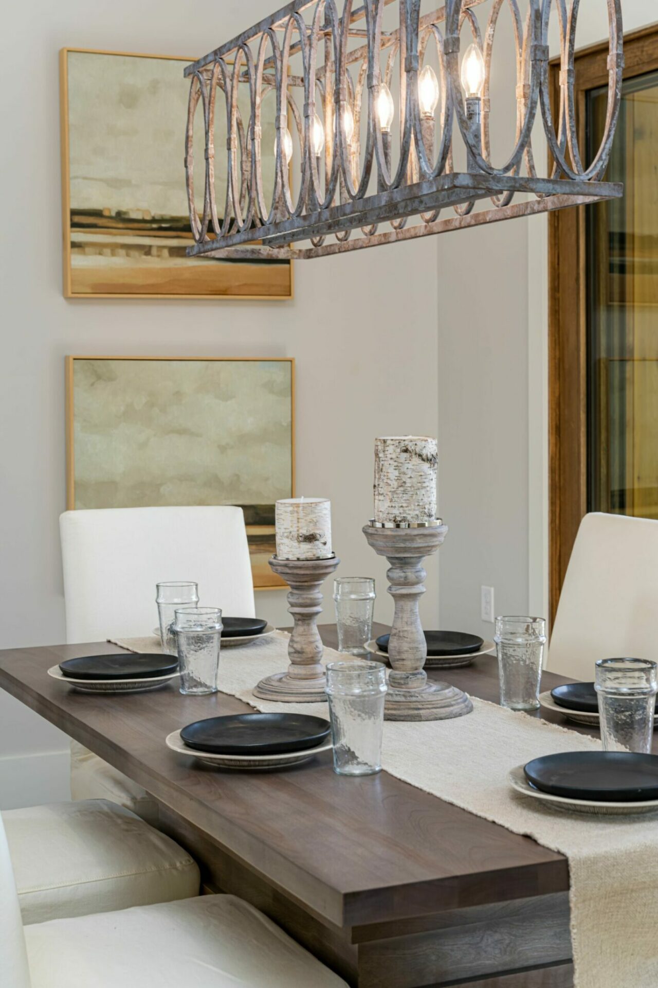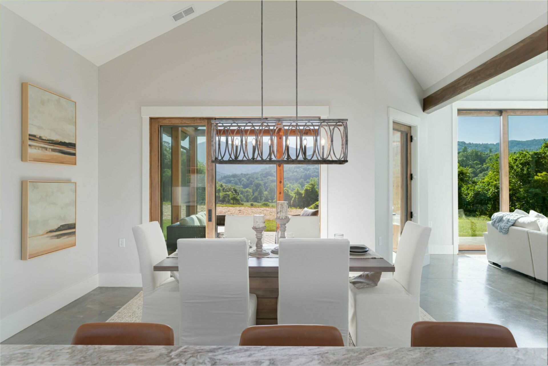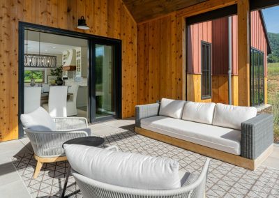 For style and aesthetics, our clients wanted a modern farmhouse style incorporated throughout their home. Exposed beams and concrete floors contributed to the rustic farmhouse feel, whereas the stylish furnishings, built-ins, and accessories highlight the modern aspect of this home. We included large sliding glass doors to create an extension of the home, while bringing the outdoors inside. Neutrals and rich honey-colored tones can be found throughout the home, allowing the interior to accentuate the exterior views. The kitchen includes textured tile from countertop to ceiling, and there is layered lighting included in the kitchen as well as throughout the home.