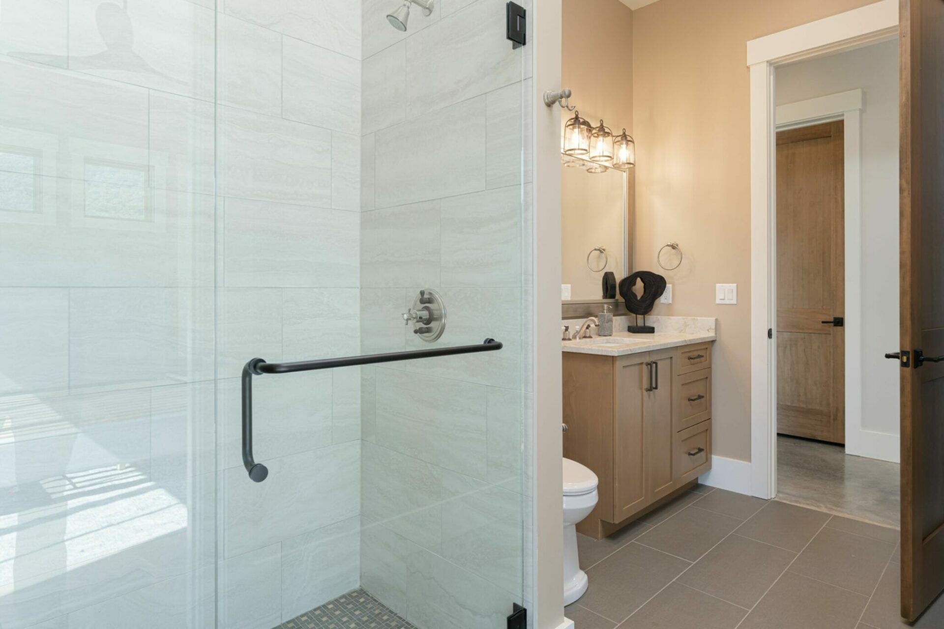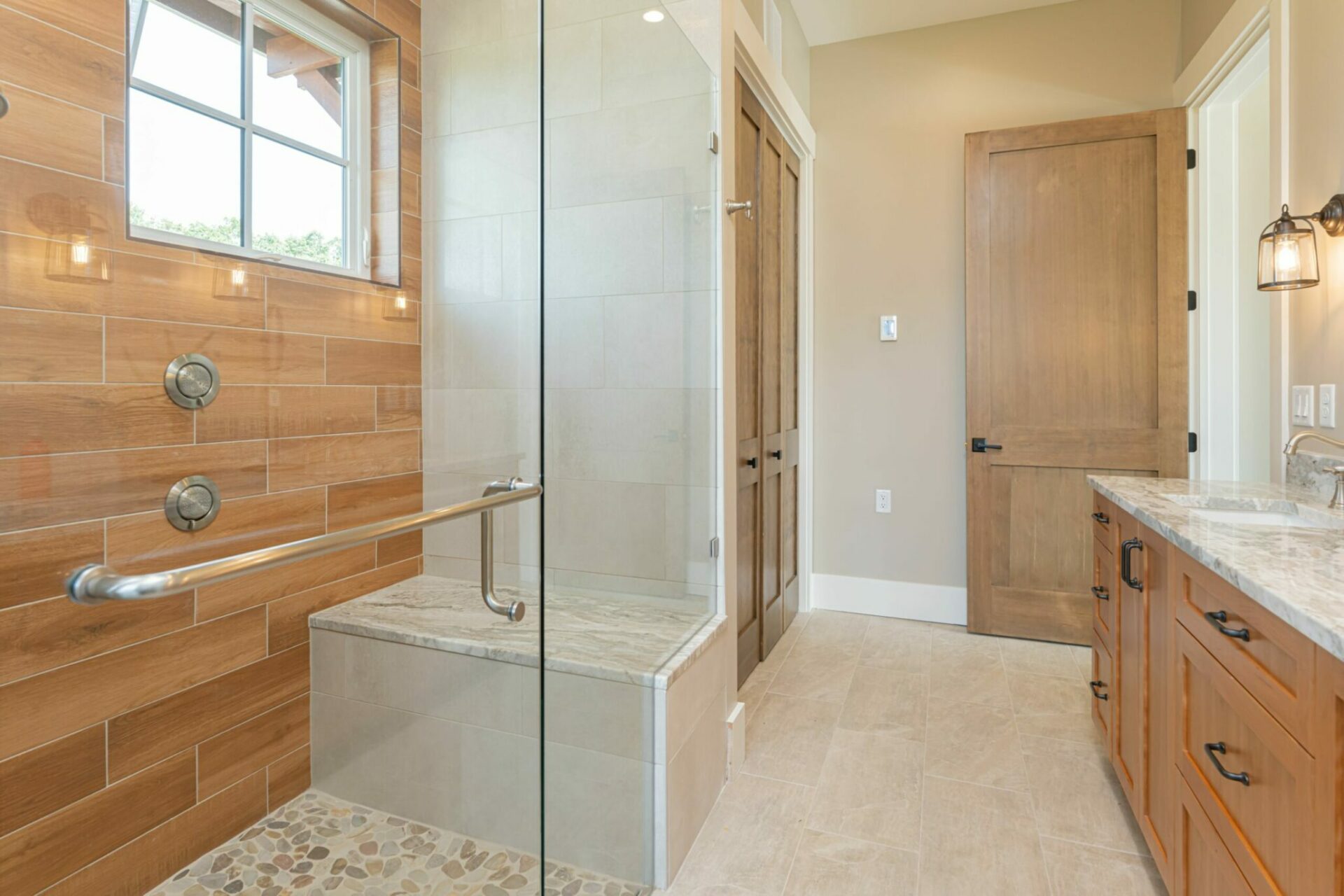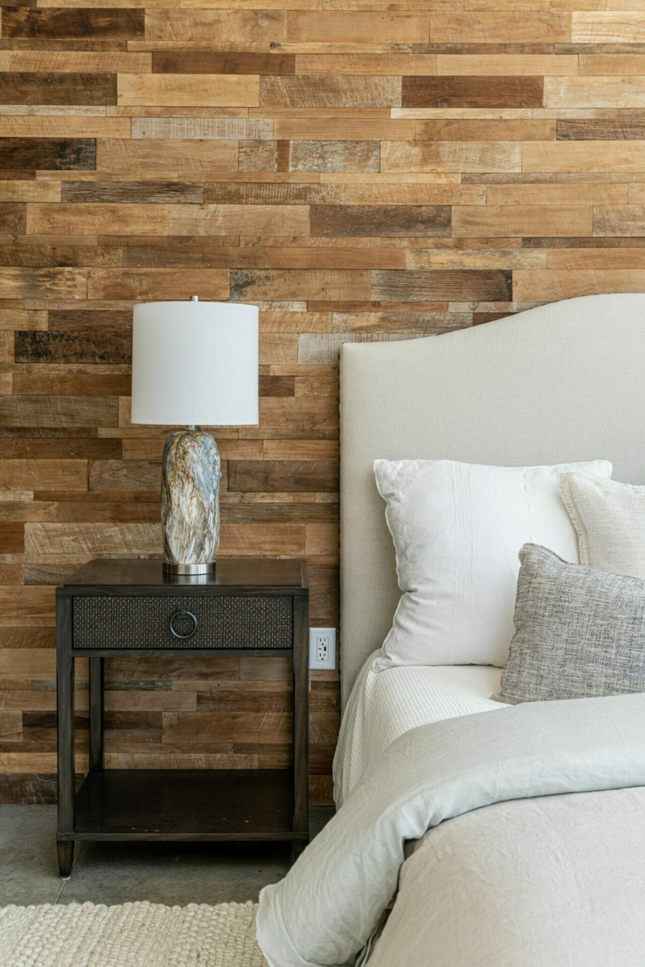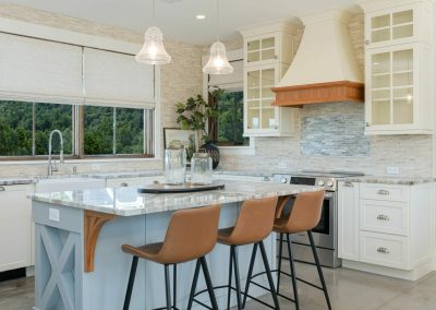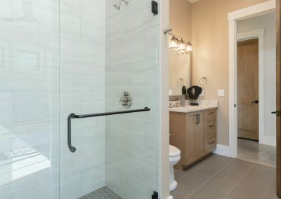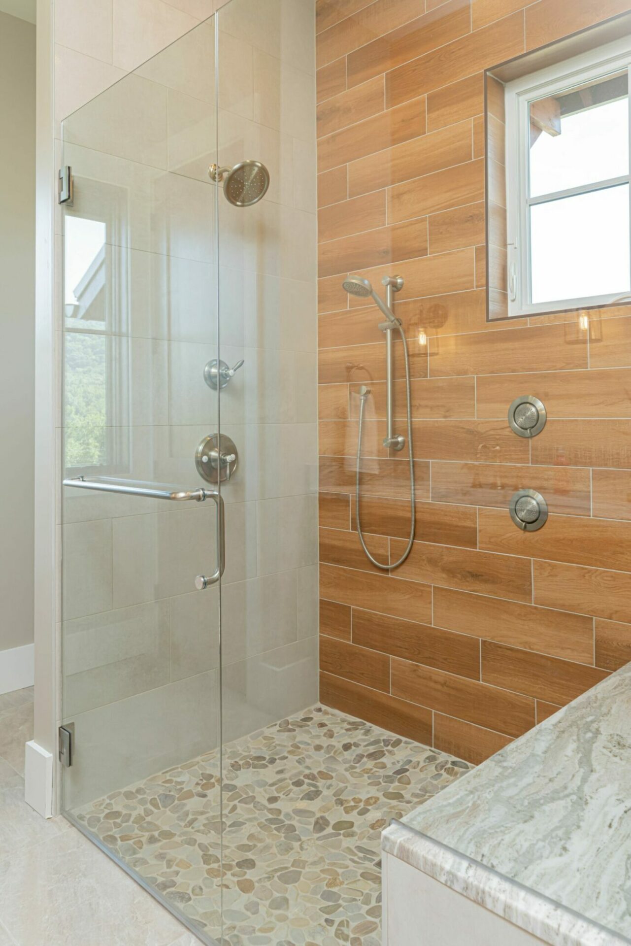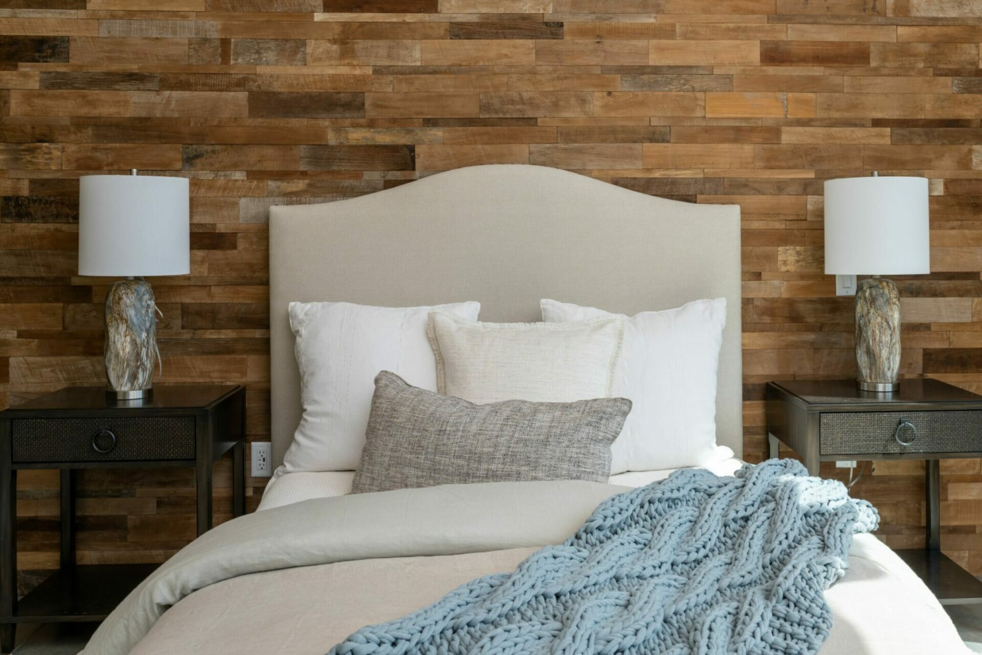 For style and aesthetics, our clients wanted a modern farmhouse style incorporated throughout their home. Exposed beams and concrete floors contributed to the rustic farmhouse feel, whereas the stylish furnishings, built-ins, and accessories highlight the modern aspect of this home. We included large sliding glass doors to create an extension of the home, while bringing the outdoors inside. Neutrals and rich honey-colored tones can be found throughout the home, allowing the interior to accentuate the exterior views. The kitchen includes textured tile from countertop to ceiling, and there is layered lighting included in the kitchen as well as throughout the home.