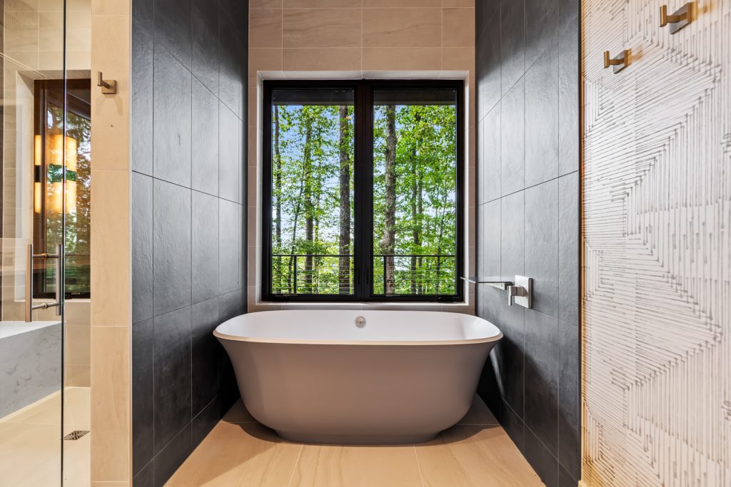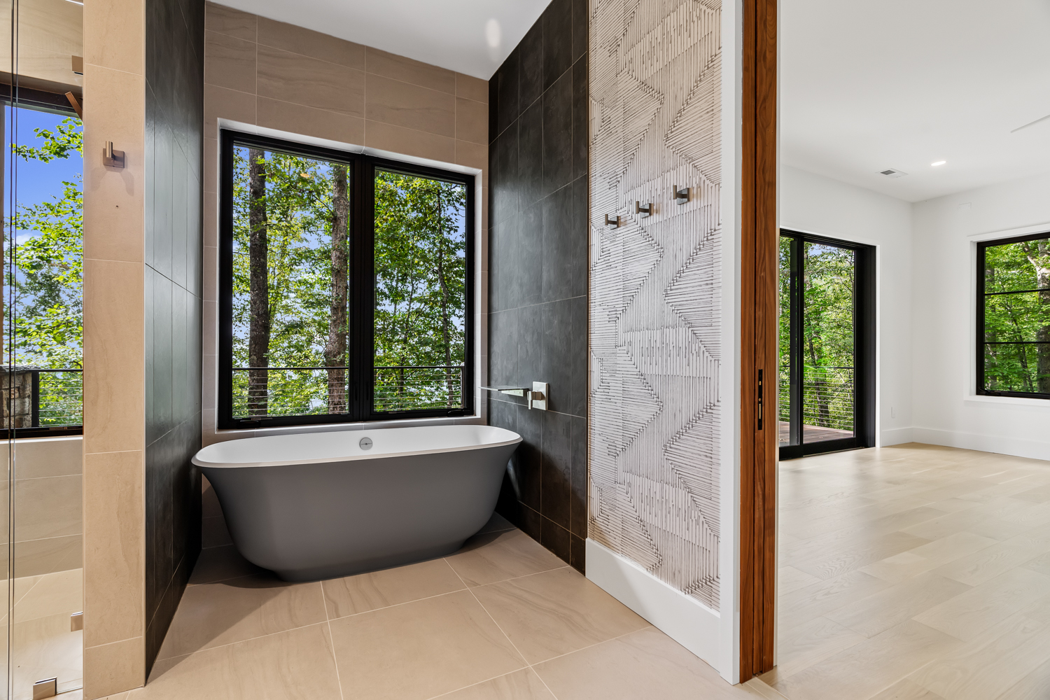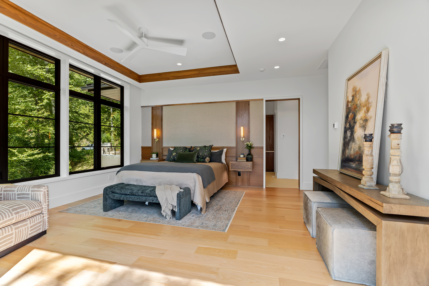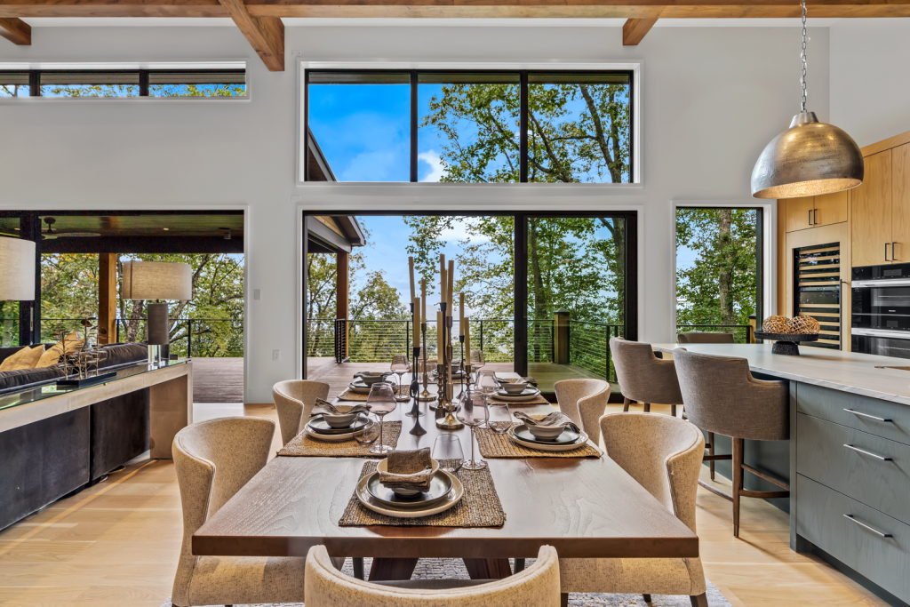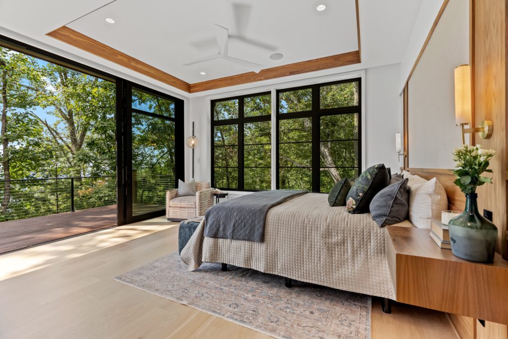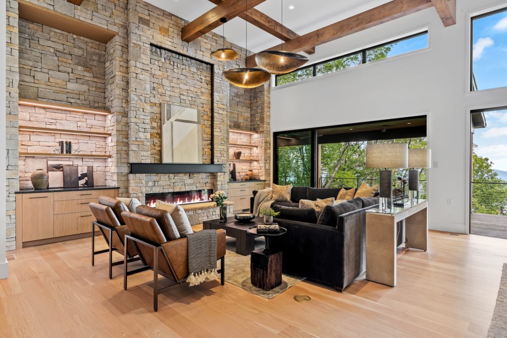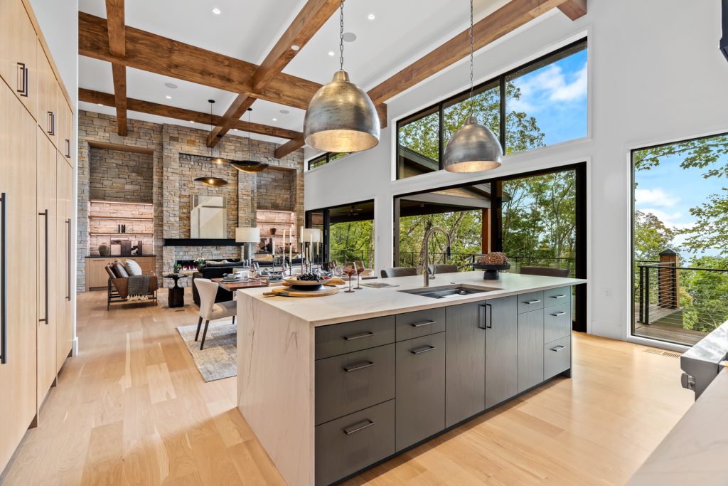 - Expansive windows and walls of glass framing sweeping views of the Blue Ridge Mountains