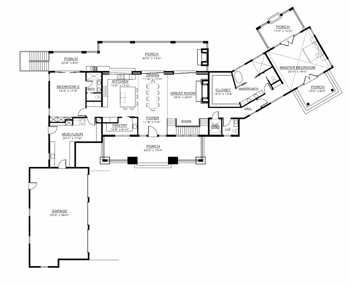 Primary suites at opposite ends of the home allow for privacy. A large kitchen and dining room, along with pantry and mud/laundry room offer functionality, while the great room opens to large outdoor living areas. The largest primary suite has private porches on both sides, and its own hallway.