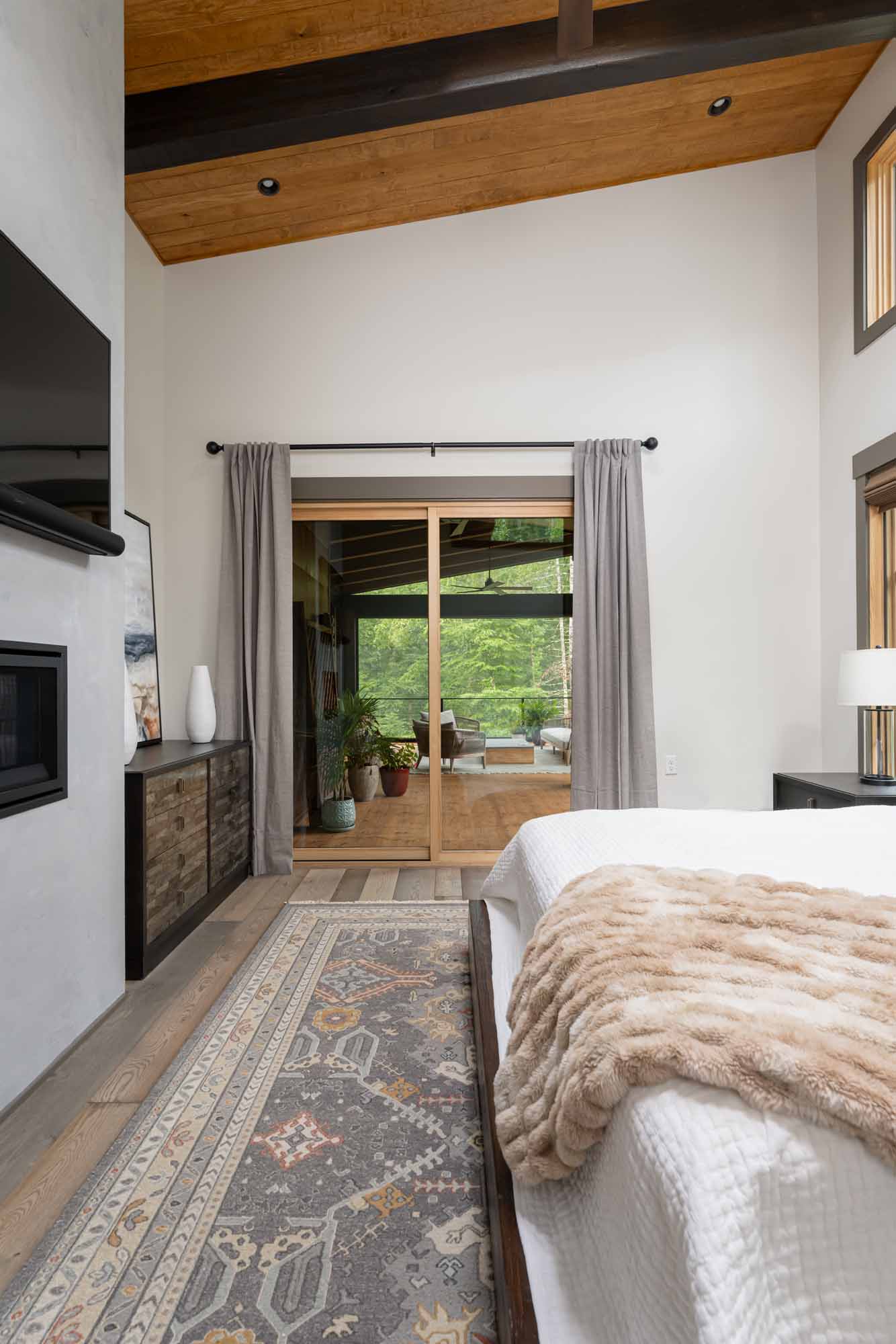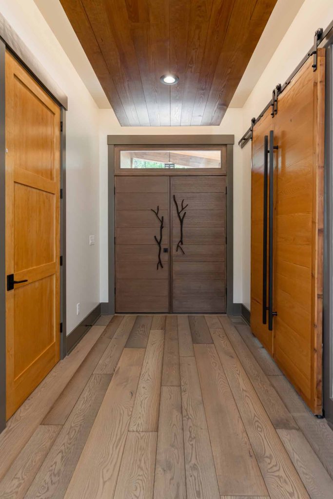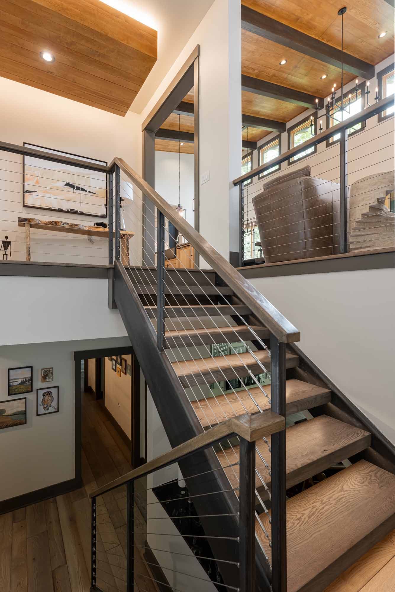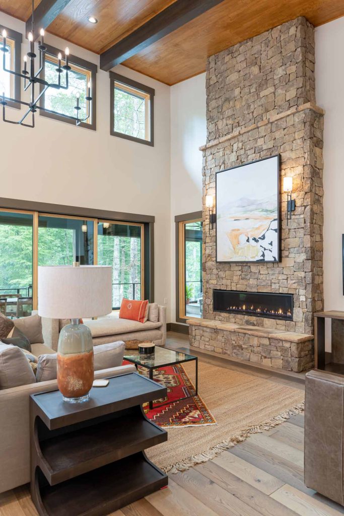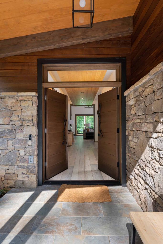Warm colors, wood and stone elements, and captivating custom details, including the hand-crafted metal tree branch handles on the front door, the wooden beams that span the vaulted ceiling, and the large windows that offer exquisite views of the surrounding trees, serve to make the home unique give it a timeless, intrinsic sense of belonging with its surroundings..