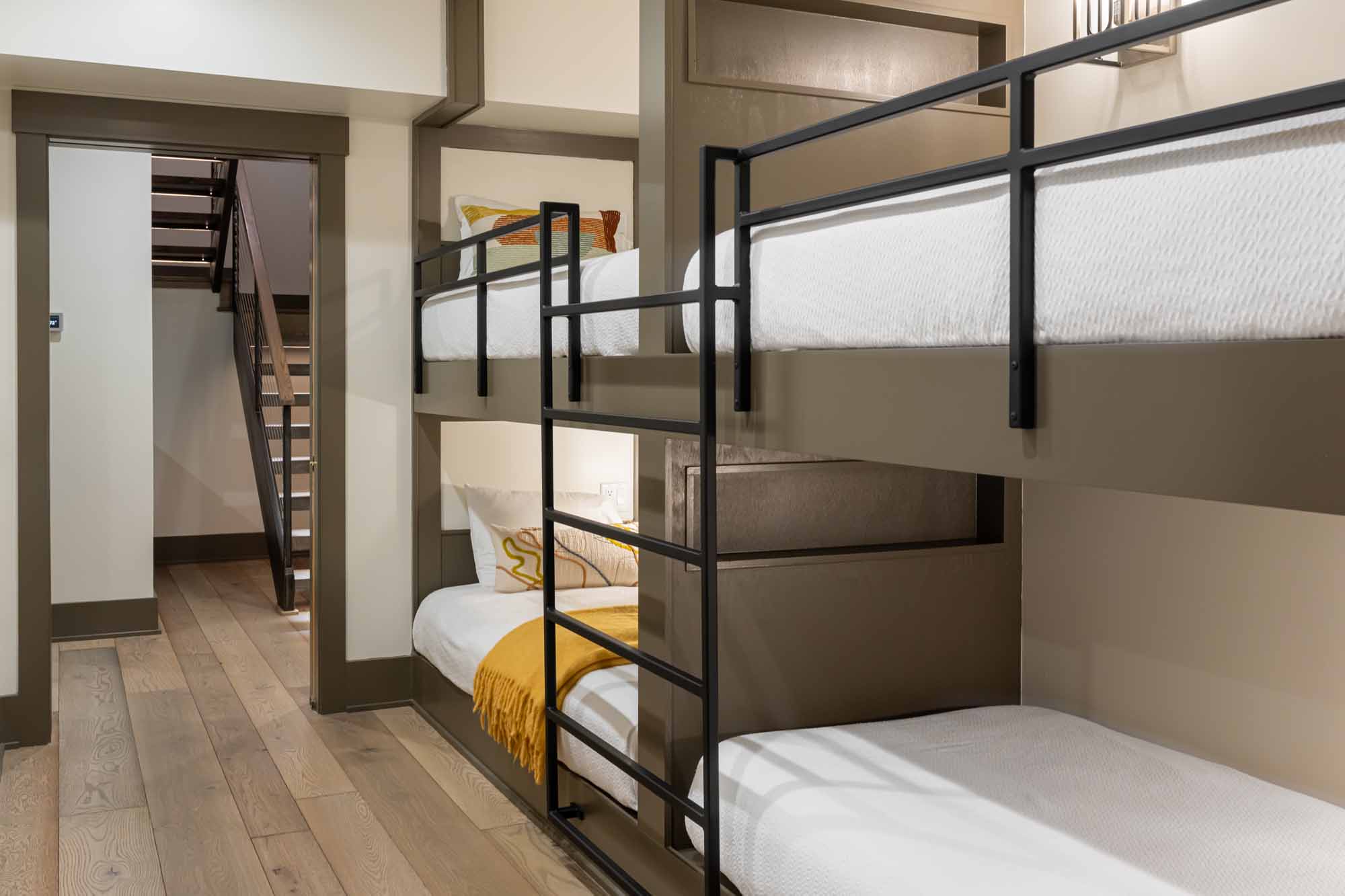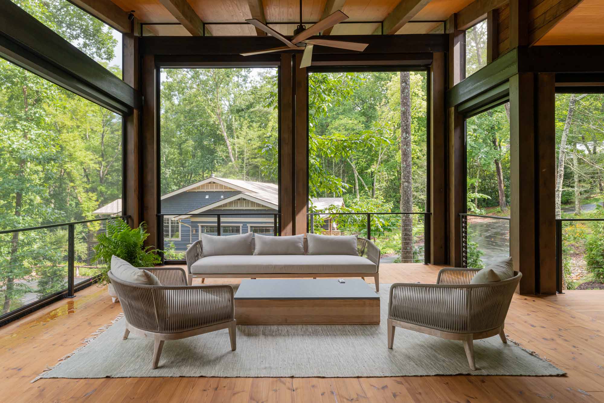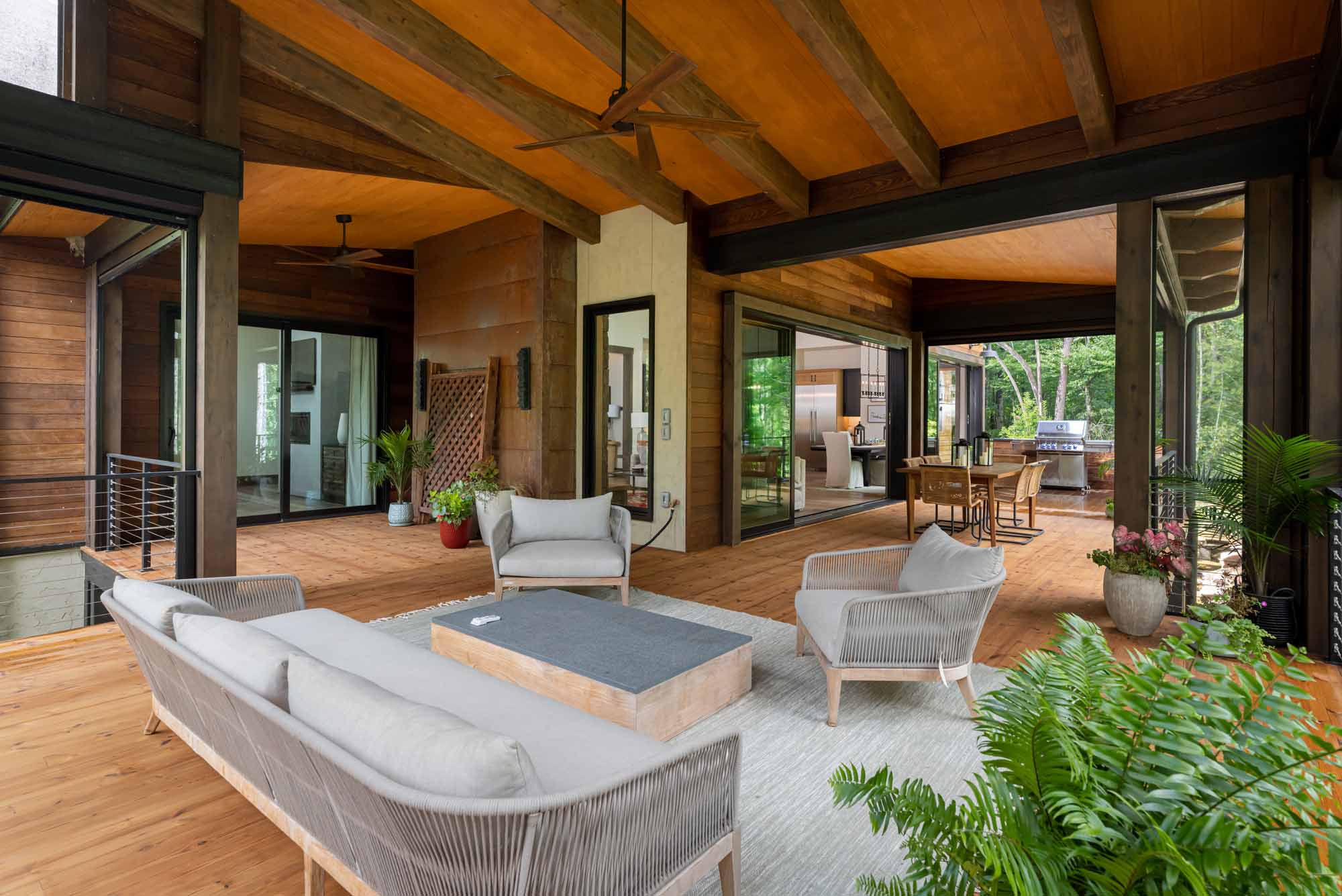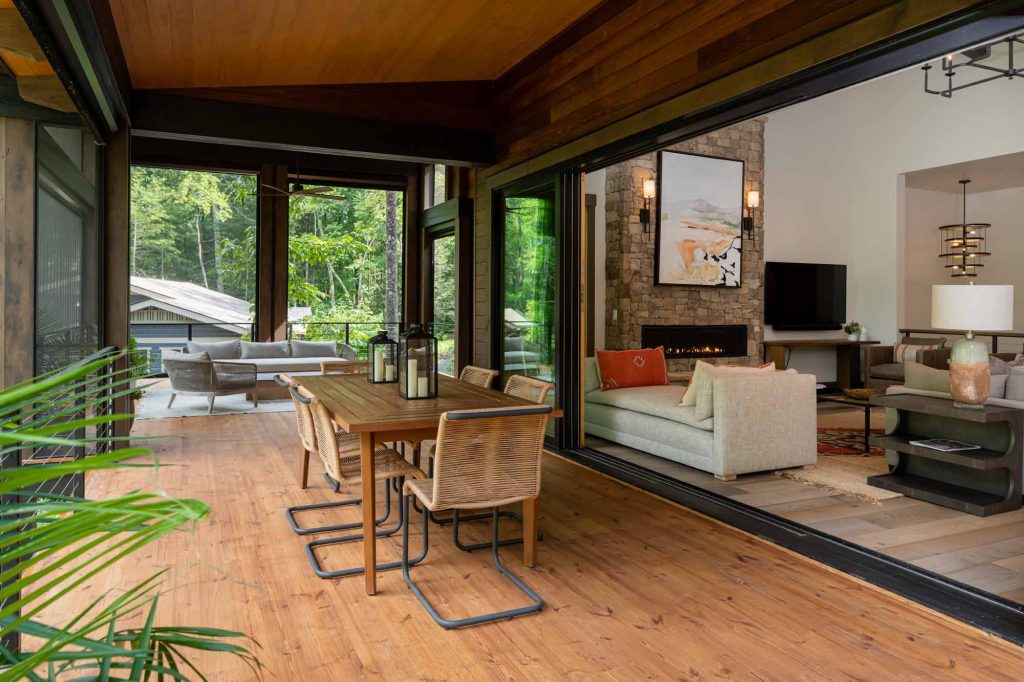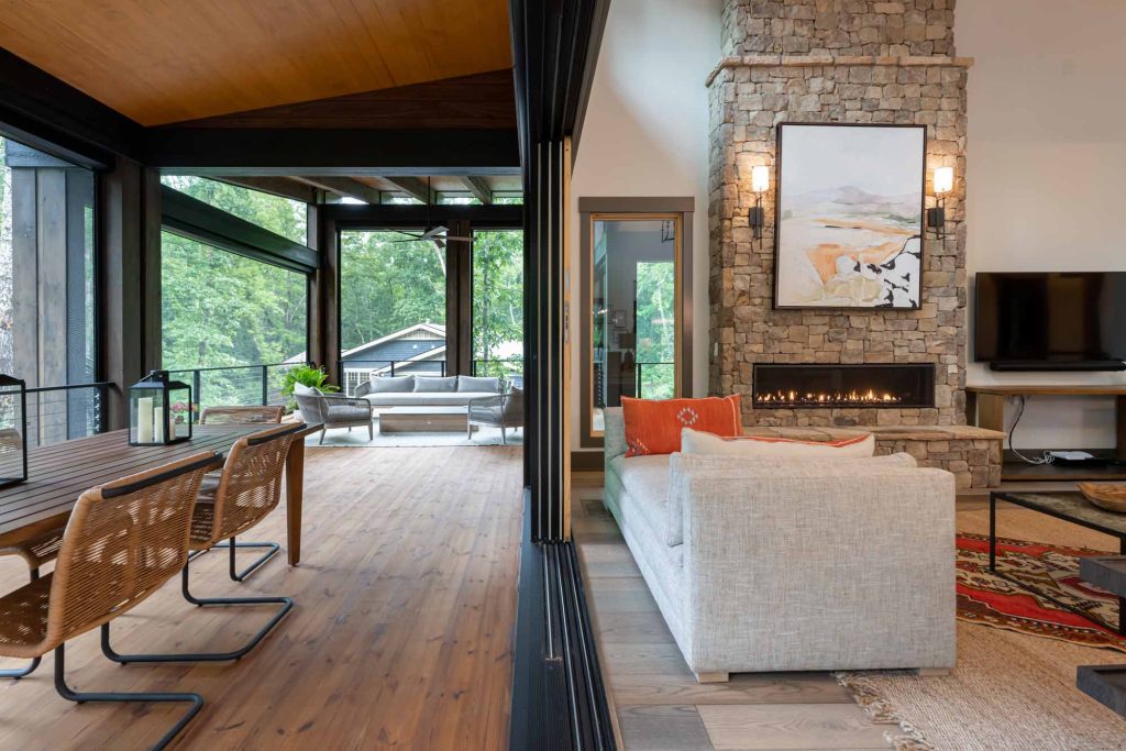 The downstairs provides a kitchenette, a bunk space, bathrooms, and a sitting room–everything needed for a home away from home. The upstairs features a large kitchen, cozy seating areas, an outdoor living space, and sliding doors that fold completely away to seamlessly blend the outdoors with the indoors.