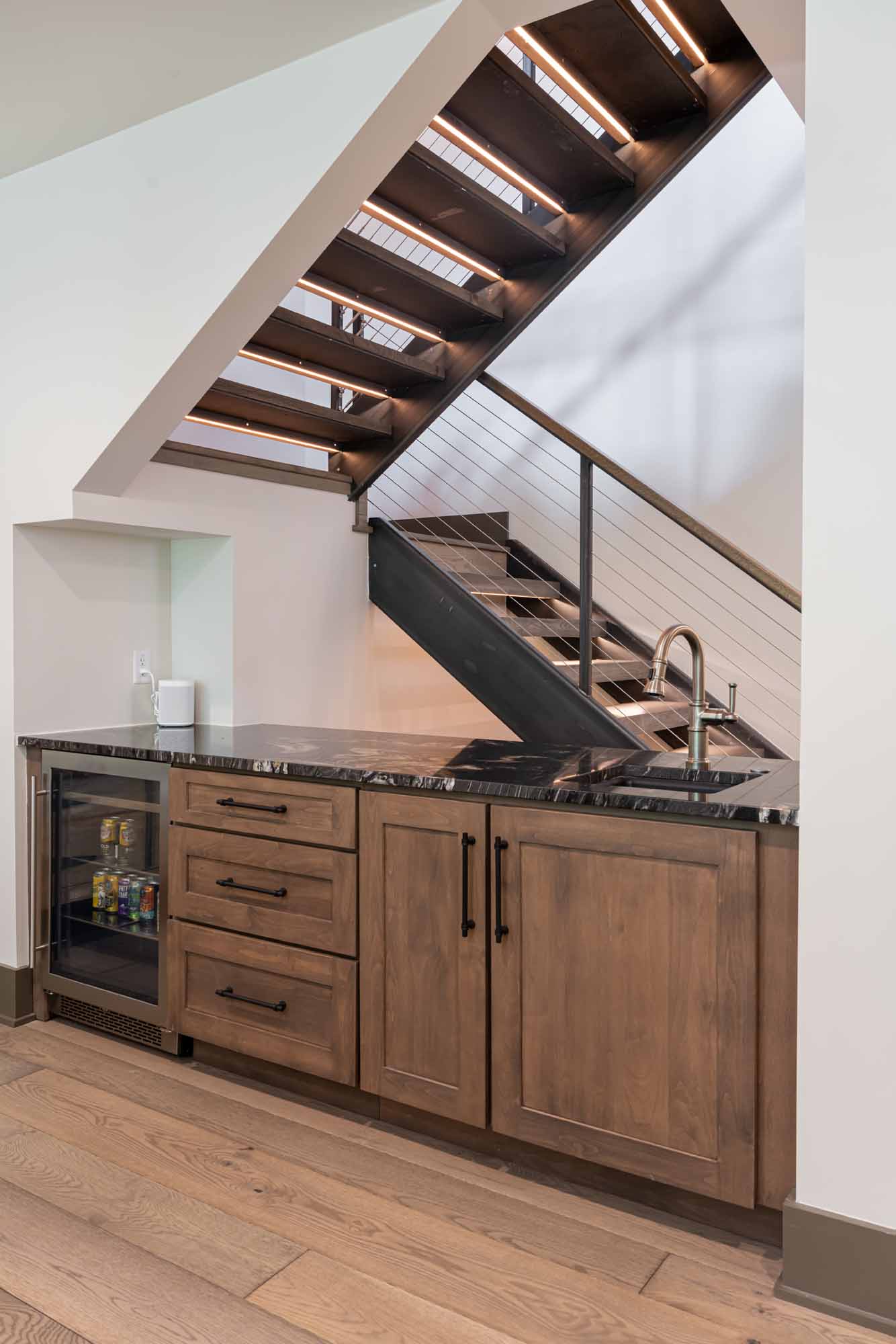 Together, the upper and lower levels create the serene, intimate gathering family gathering space Mr. Tremlett always imagined. But there was more to the concept of longevity than the home’s function. There was also the style to consider.